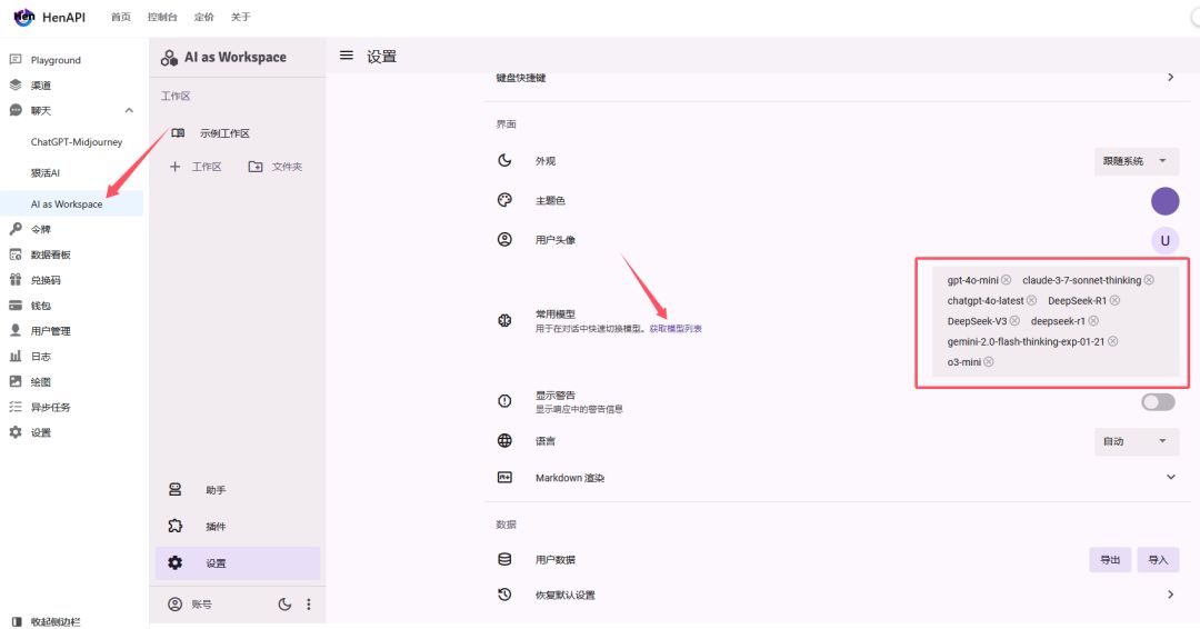 系统会自动填入我们平台的API Key和调用地址,只需将需要用到的模型获取选择一下就可以了