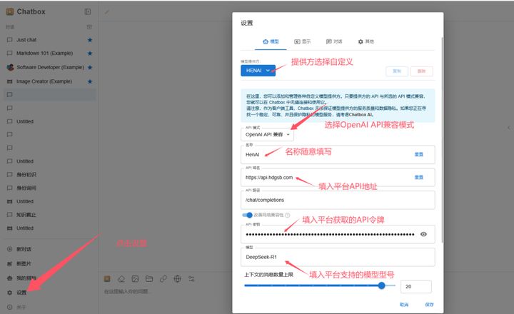 例如在ChatBox中这样设置:添加自定义模型提供方,API模式选择OpenAI API兼容模式,其他选项如下方图片所示填写即可使用