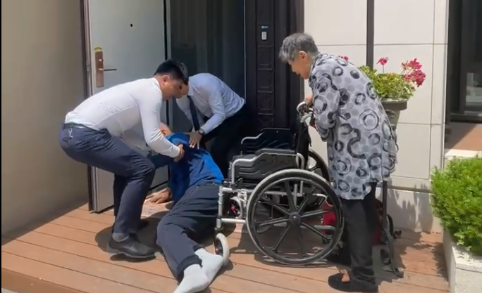 在链家大华锦绣店工作的方亚峰和李辉,午后正陪同一位客户在小区看房,忽然听到一声声呼救。循声找去,发现一位老奶奶站在路边,脸上满是焦急和惊慌。不远处,一位九十多岁的大爷从轮椅上摔下,正躺在地上。方亚峰和李辉没有丝毫犹豫,立即放下手头的工作冲过去,俩人用力将老人稳稳地扶回轮椅。