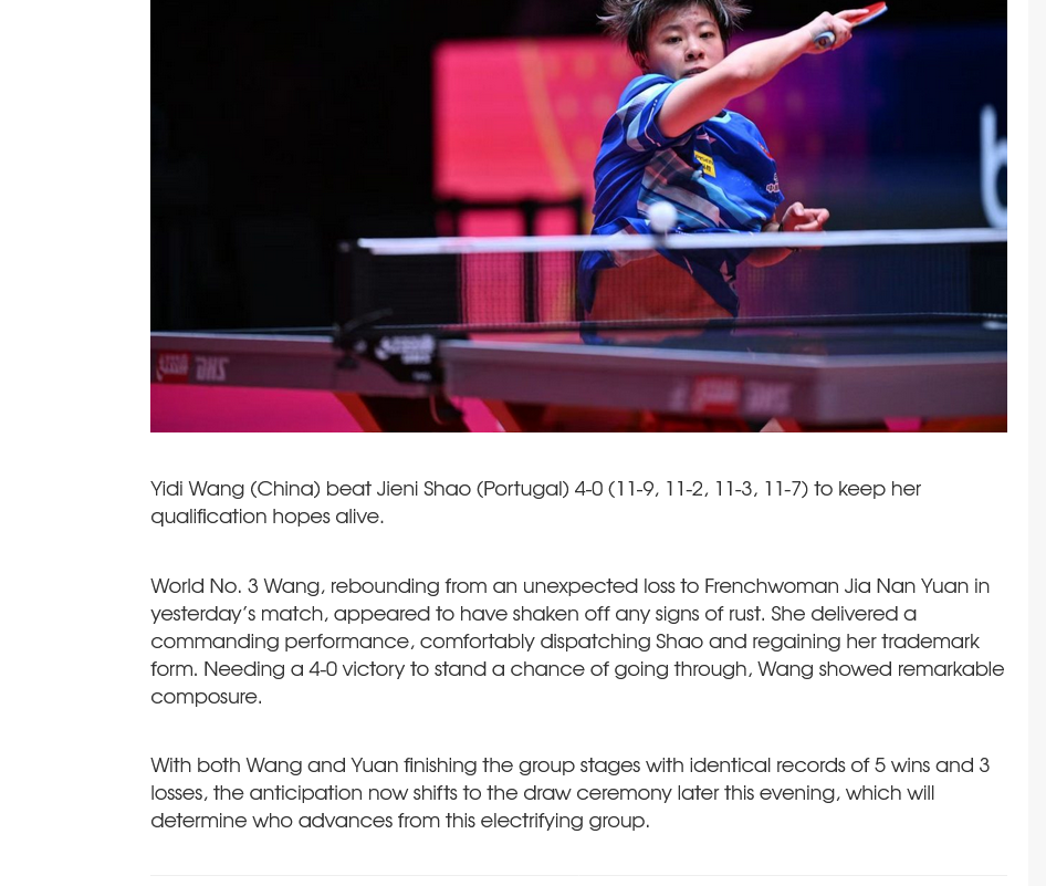 由于王艺迪与袁嘉楠的战绩都是5胜3负,国际乒联官方似乎也没搞清楚。于是,官方文章指出王艺迪4-0获胜后保留晋级希望,最后由抽签决定谁能晋级,难怪国际乒联被称为“草台班子”。