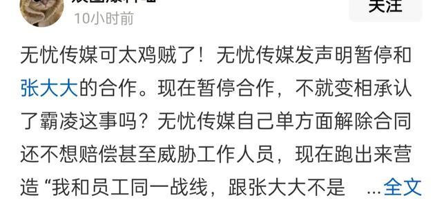 到了1月26日,可能兜不住了,无忧传媒发布声明称,鉴于此事调查仍在进行当中,经公司慎重考虑,无忧传媒暂停与张某的一切业务开展,并将持续彻查此事。