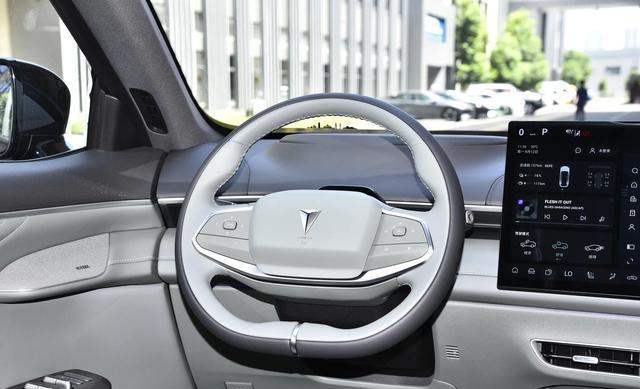 内饰简约,D形双辐方向盘白灰双拼,带多功能键,有凸起设计。无传统仪表盘,视觉简洁。中控屏15.6英寸,悬浮式显现代。背面饰条连出风口,新潮。扶手台简洁实用。
