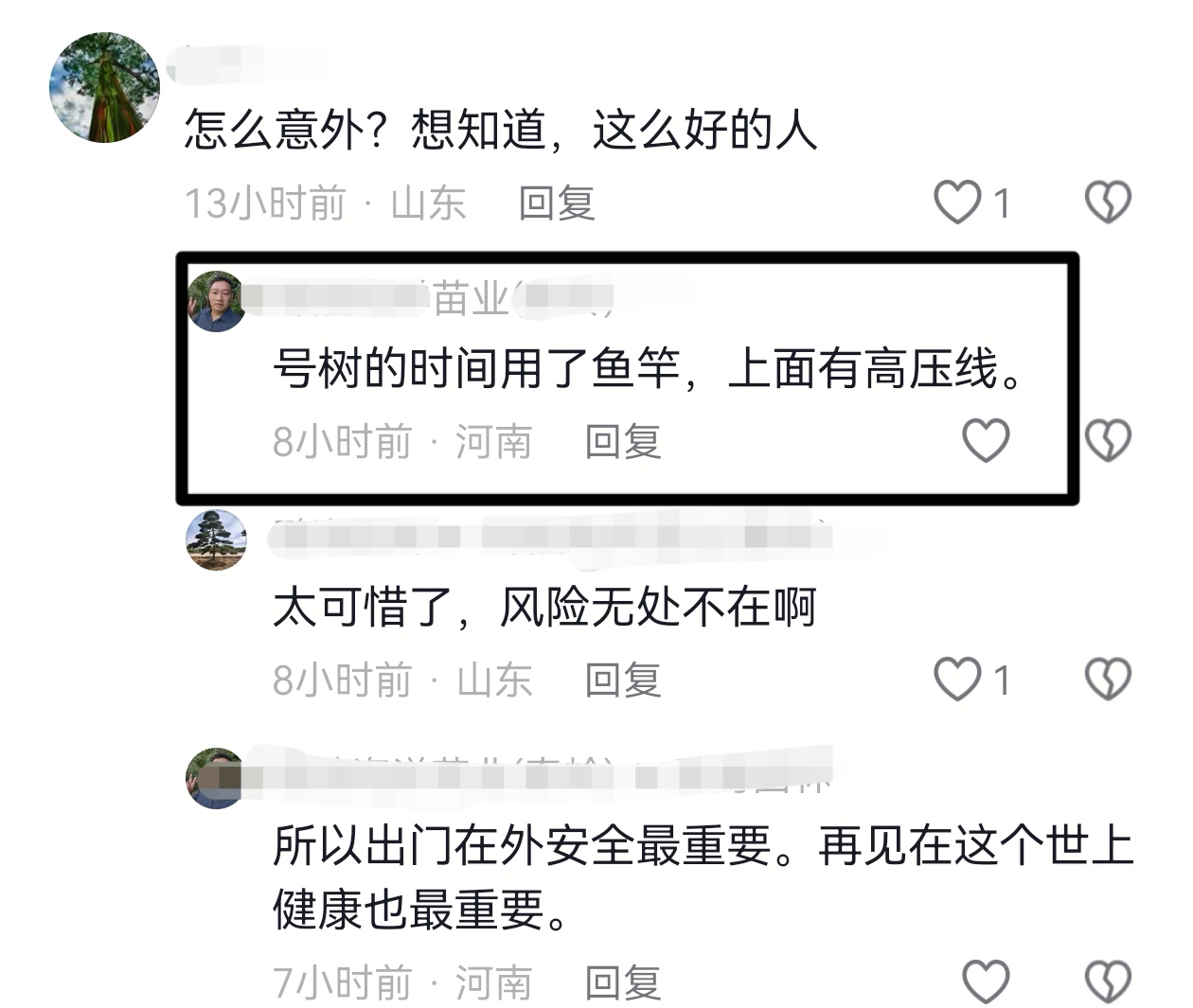 其中有一条留言给出了明确的原因,事发当天李文良在选树的间歇用了鱼竿,上方有高压线,最终导致触电,该知情人还强调出门在外要注意安全。