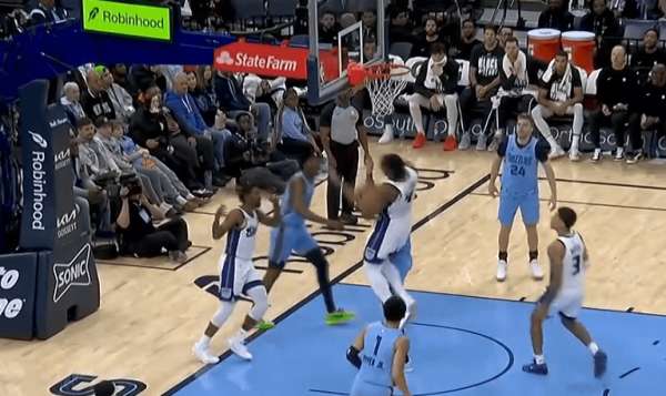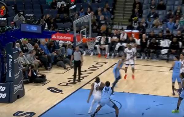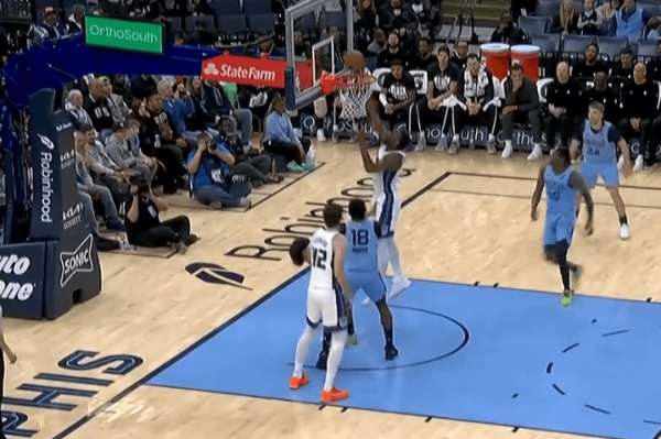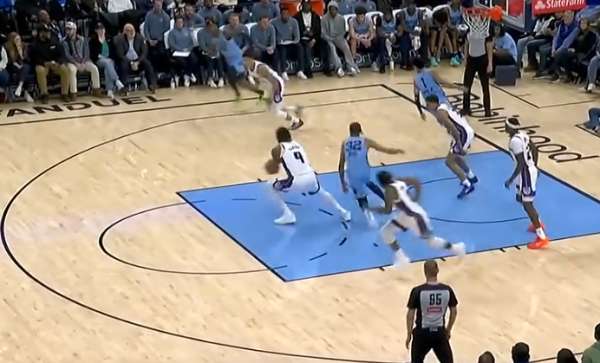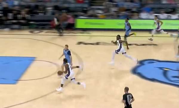 炸球转身调整后迎着防守人上篮稳稳放进。