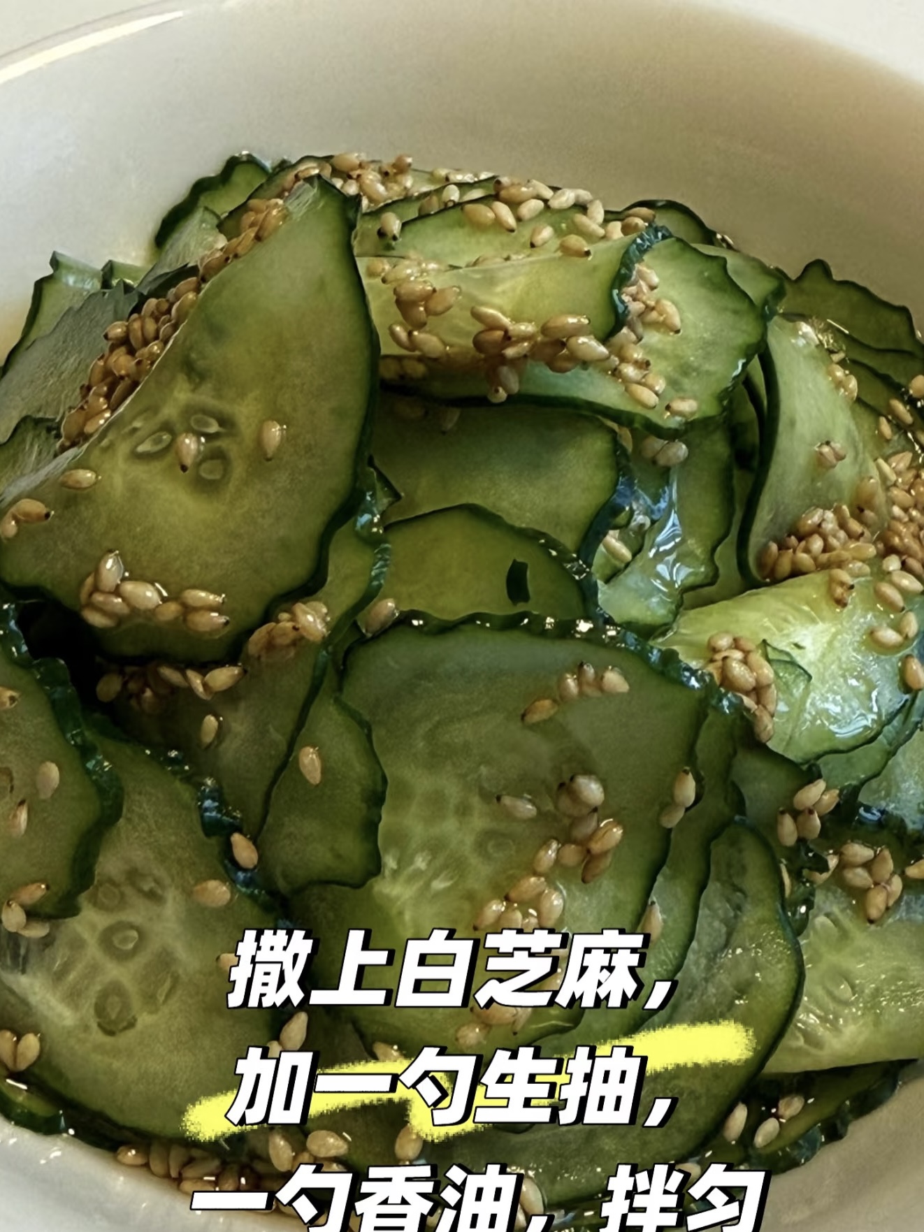 最后来一勺“点亮酱油”。1勺生抽+半勺香油混合,轻淋表面,酱油色在黄瓜片上晕开,像给翡翠镶金边。不吃生酱的也可省略,单靠芝麻+黄瓜原味就很好吃。想再豪华,撒一把炸花生碎,香到跺脚。