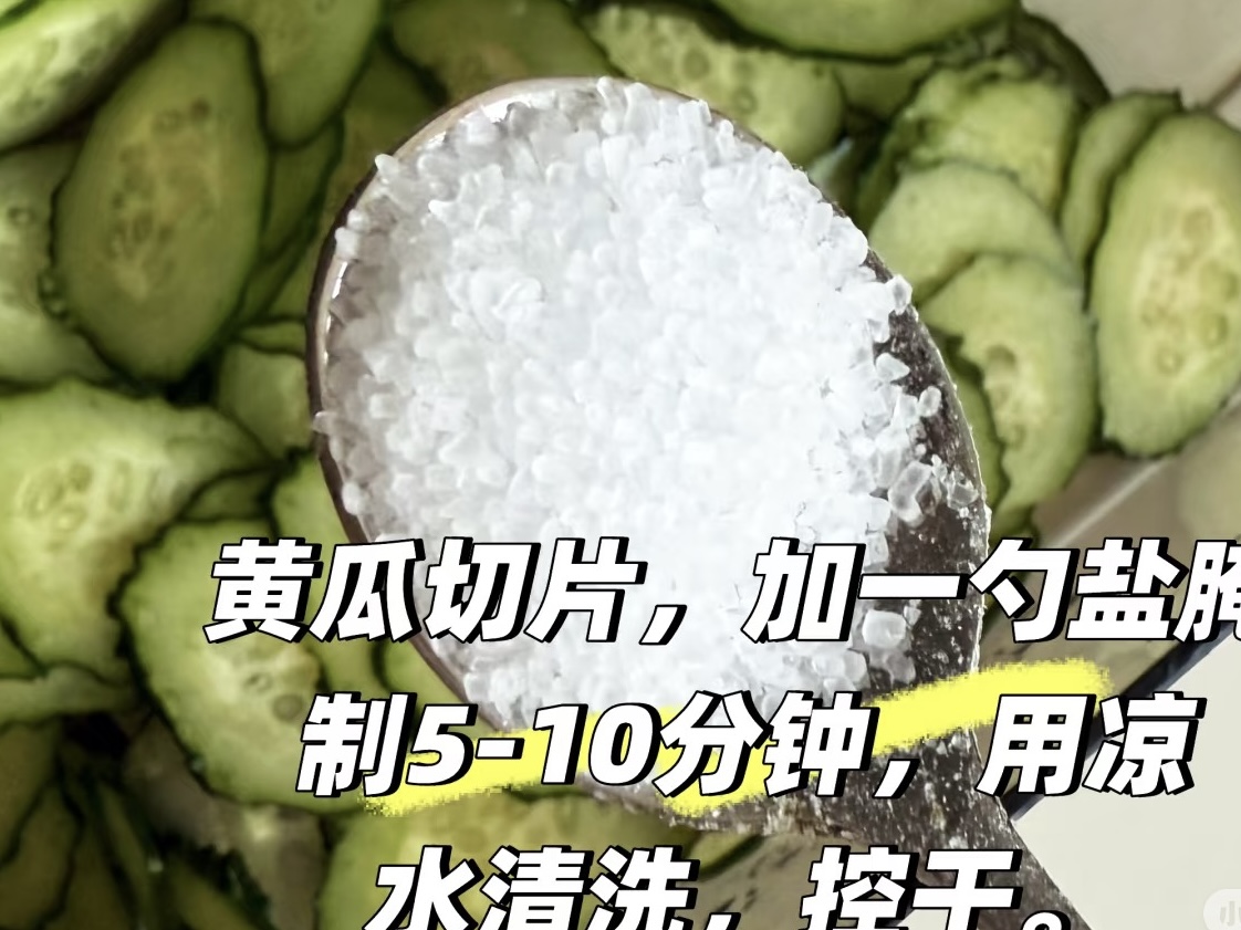 先给黄瓜“选美”。挑笔直顶花带刺的“青壮派”,表皮越绿越脆,弯瓜老籽可不行。去头去尾,用削皮刀转圈削成超薄长片,厚度1毫米左右,能透光最佳。刀工废柴党直接上刨片器,3秒一条,均匀又安全。削完放碗里,加1勺盐抓匀,静置5分钟,让黄瓜片“出出汗”,水分跑掉,后面才能“脆到灵魂”。