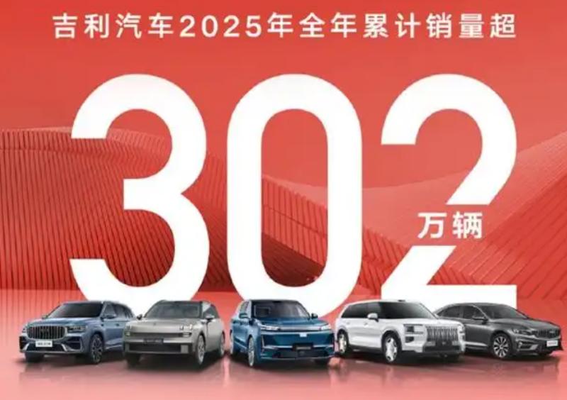 同样达成年销量目标的传统车企集团还有吉利汽车,不过,吉利汽车则是表现出了较比亚迪更出众的增长态势。数据显示,2025年12月,吉利汽车实现销量23.68万辆,同比增长13%;全年累计销量达到302.46万辆,同比增长39%,也压线完成了上调后的300万辆销量目标。
