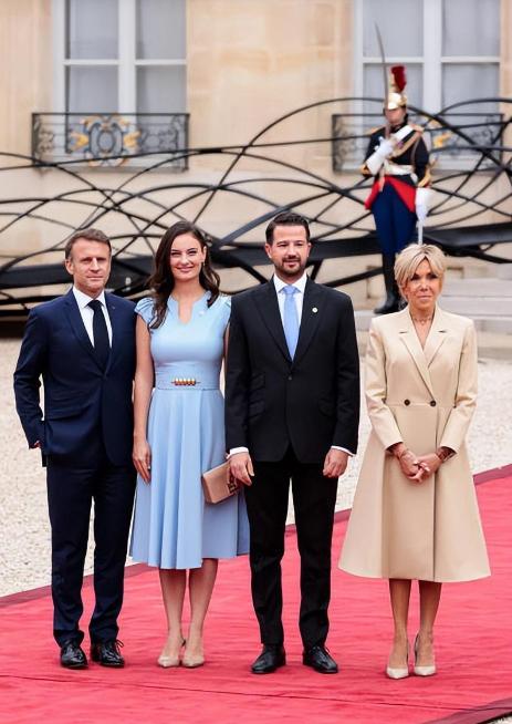 有趣的是:马克龙当天穿搭了一袭深蓝色的西装配上了深色的领带,这样的穿搭,与蓝色优雅长裙的黑山第一夫人站在一起,居然拥有着一股子难以言明的般配感。