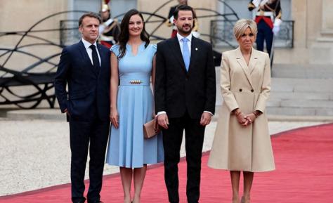 法国总统马克龙带着“娇妻”布丽吉特一同接待了这对年轻但名气不菲的黑山总统夫妇,出于礼仪:马克龙与黑山第一夫人并肩站着,亚科夫与布丽吉特和站。