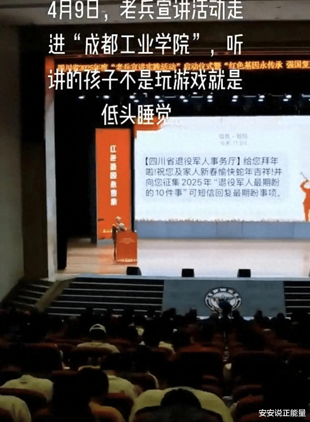 近日,有网友分享视频称四川成都一所大学为了培养学生的爱国情怀,特意邀请了一位老兵到学校开展宣讲活动,想通过老兵的先进事迹来让学生感悟生活,感恩先辈的无私付出。然而在活动现场,结果却事与愿违。