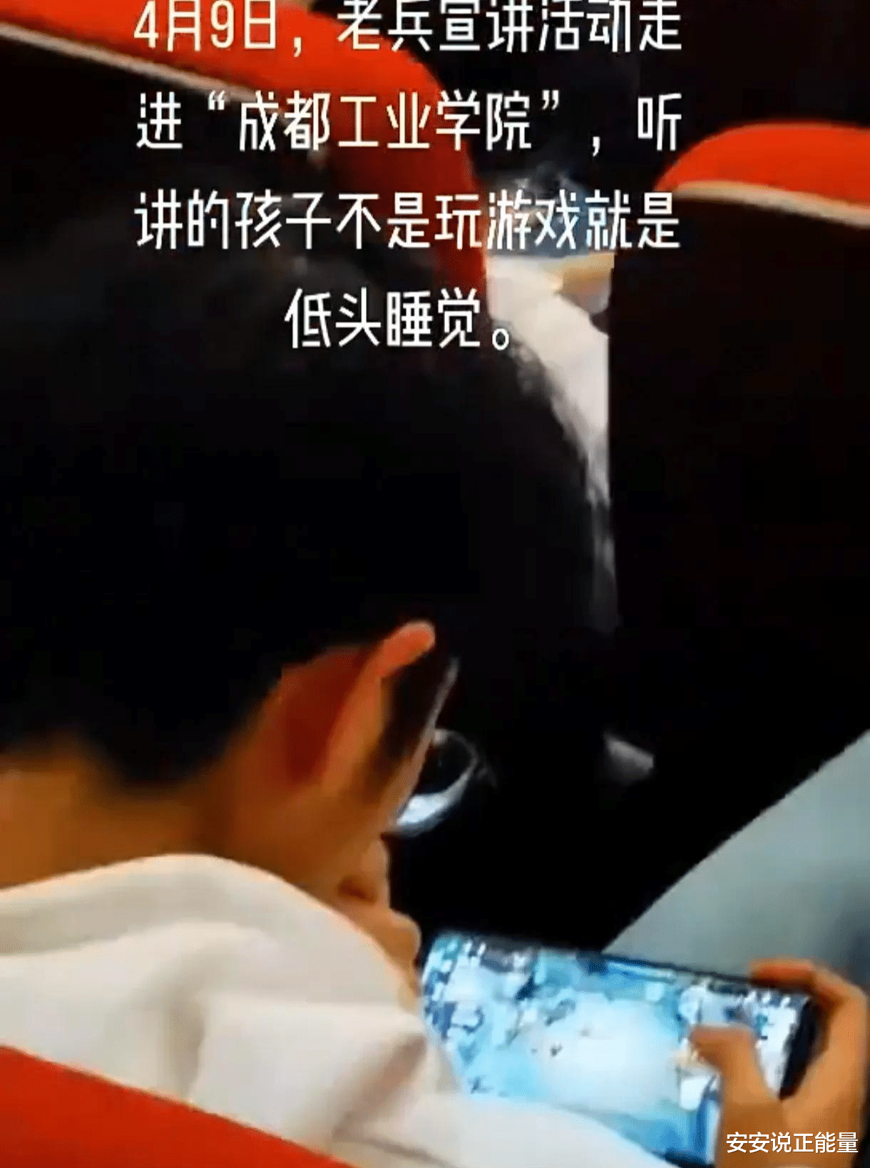 镜头一转来到了台下的大学生们,画面让人不堪入目,大吃一惊。只见有不少学生正在低头拿着手机玩网络游戏,全神贯注地盯着手机屏幕,双手不停地随着游戏画面的切换而做动作。至于台上老兵在讲什么,他们一句话也没有听进去。