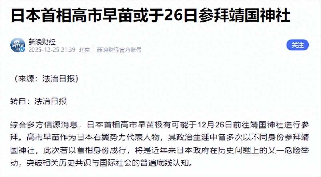 最近有个消息让东亚局势更紧了,日本首相高市早苗打算在12月26日去靖国神社参拜,这天正好是她老师安倍晋三当年去的日子,新官刚上任就这么做,显然是想看看中国会怎么反应。