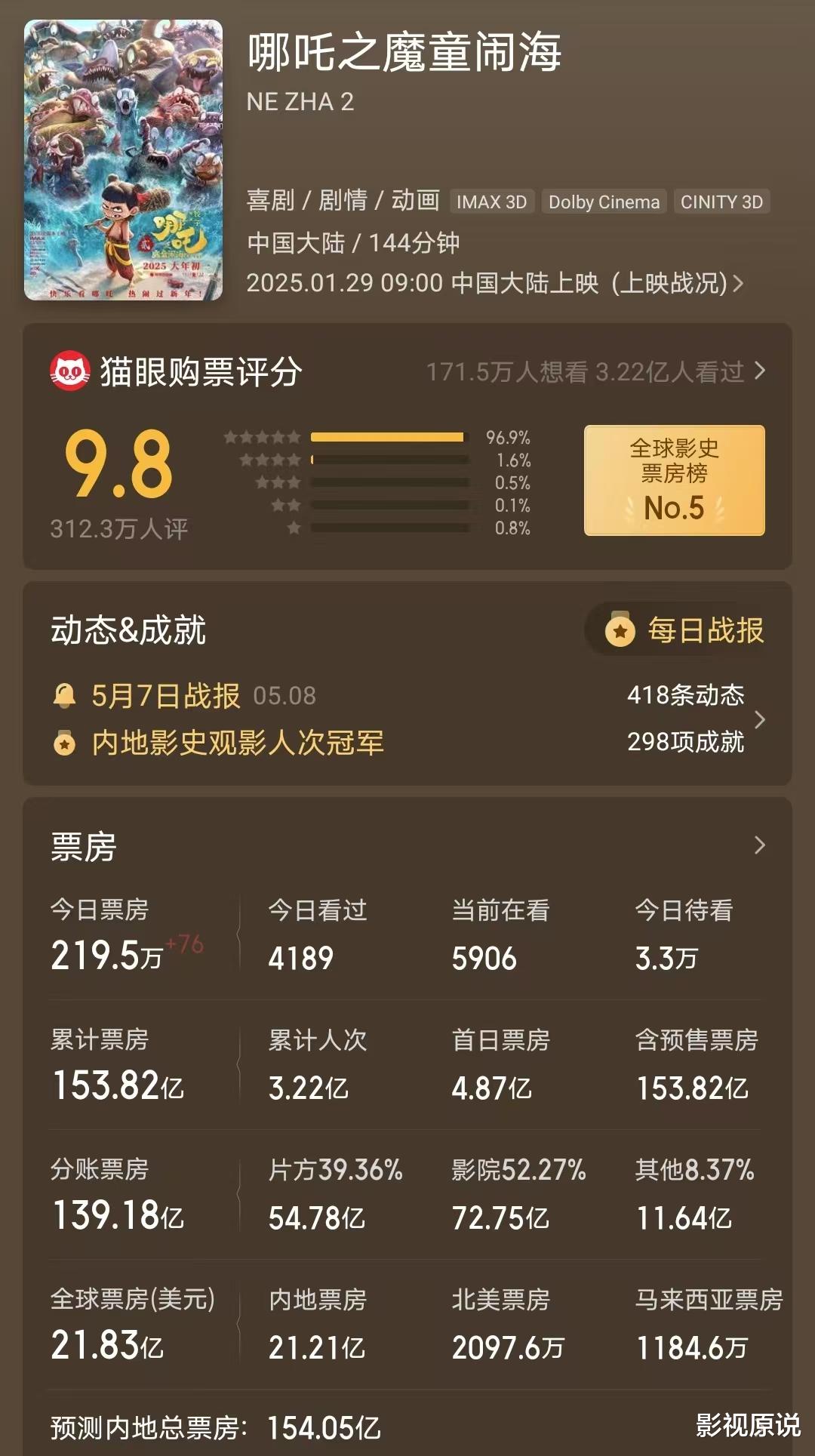 超136万人在网上为《哪吒2》打出了8.5分,好于96%的剧情片,好于98%的喜剧片,中评和差评率是17.7%。