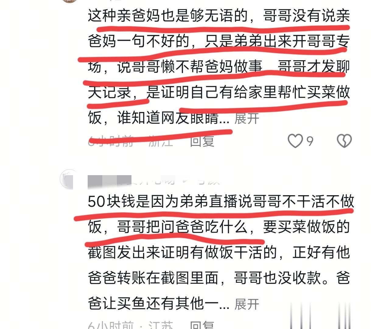 可这件事是双胞胎弟弟一直在说哥哥在南京的家不做饭,哥哥不得已亮出了聊天记录,网友才发现了50元买菜钱的事情,而且朱进在直播中没有说过亲生父母的一点坏话,这些大家有目共睹。