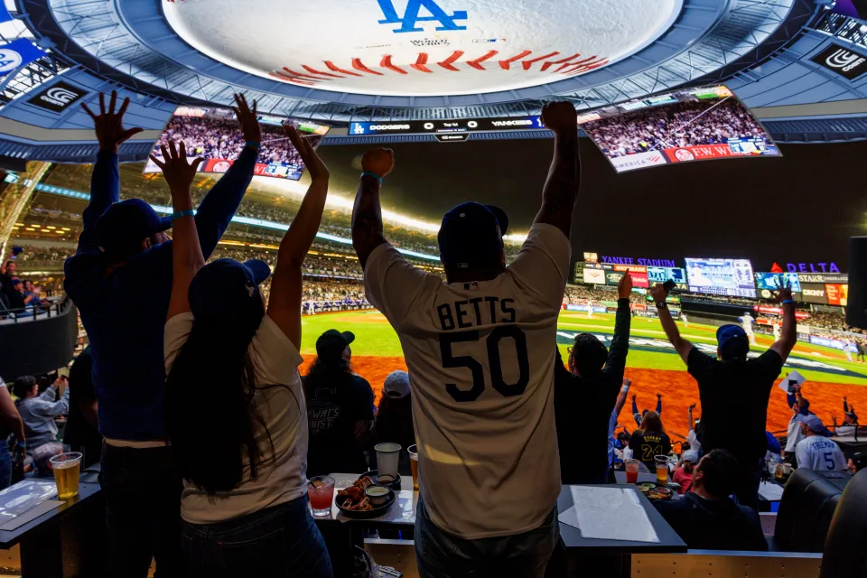 洛杉矶道奇队球迷在洛杉矶宇宙中心穹顶体育馆现场观看世界大赛