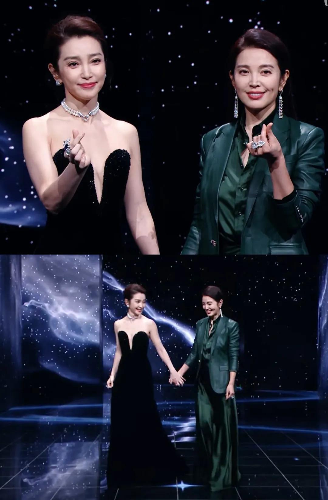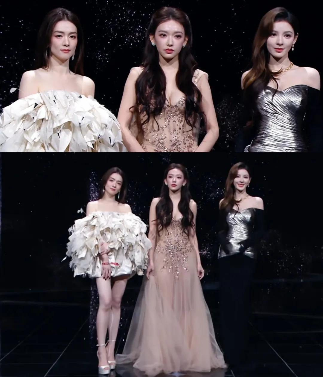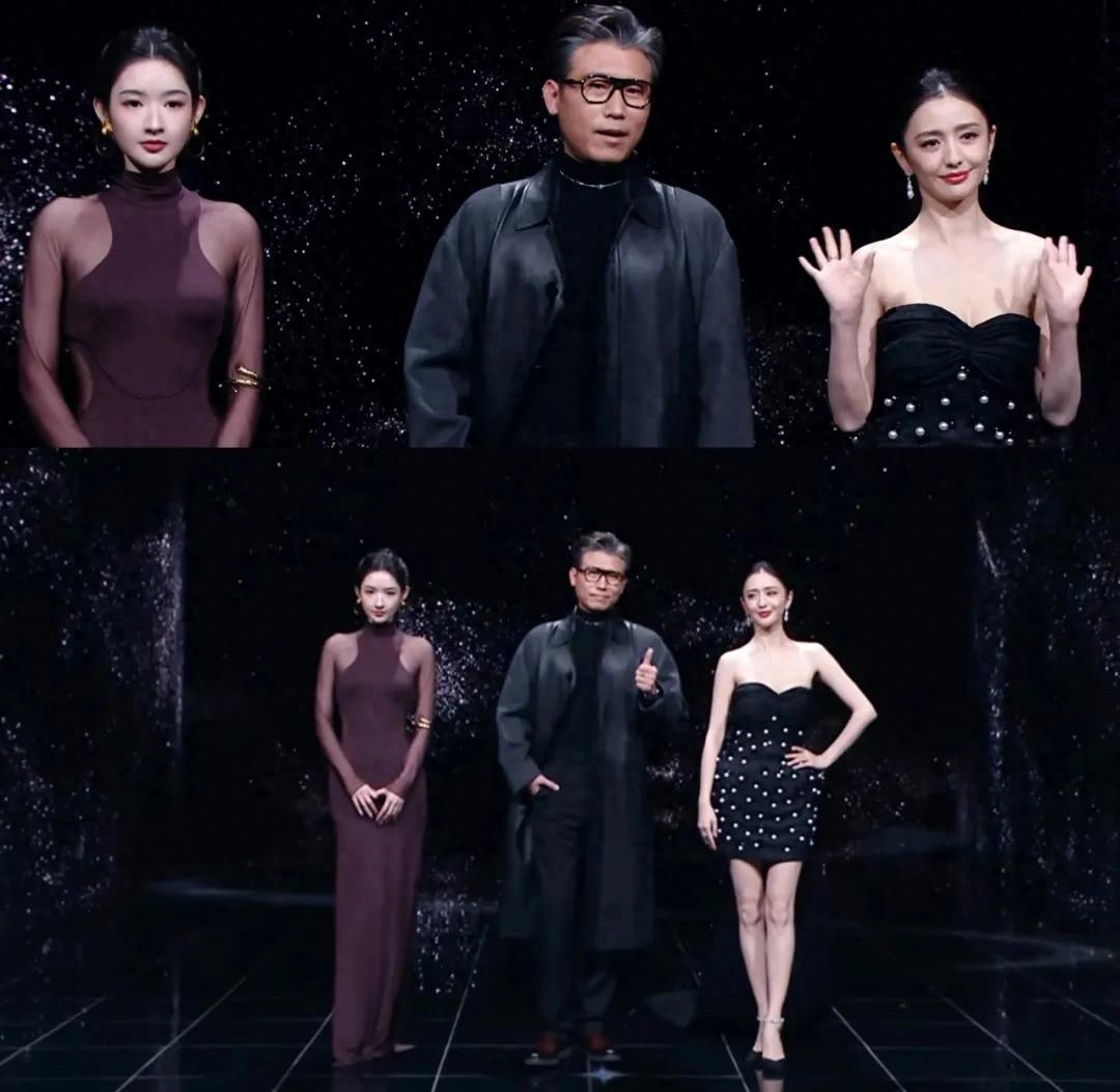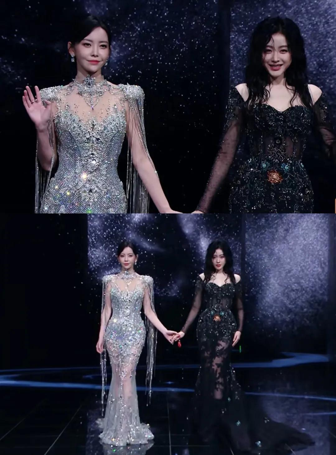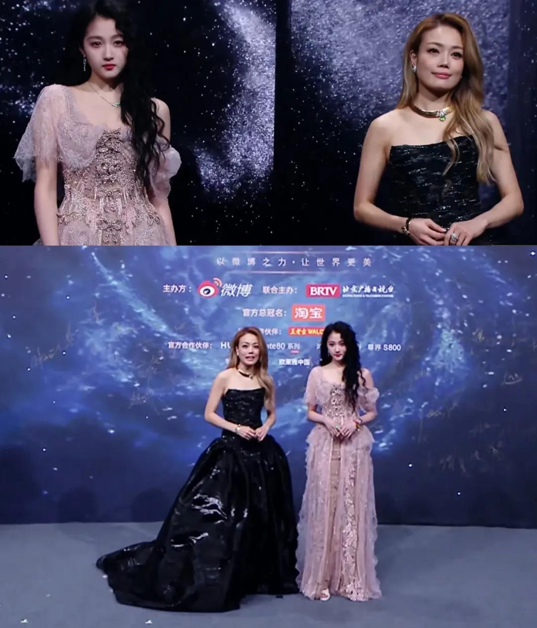 于文文和张天爱穿了一银一黑的礼服,两人的纱裙恰好都有亮片装饰,挺有默契的。不过张天爱的黑裙仿佛跟深色的背景墙融为一体了,相对没那么亮眼。