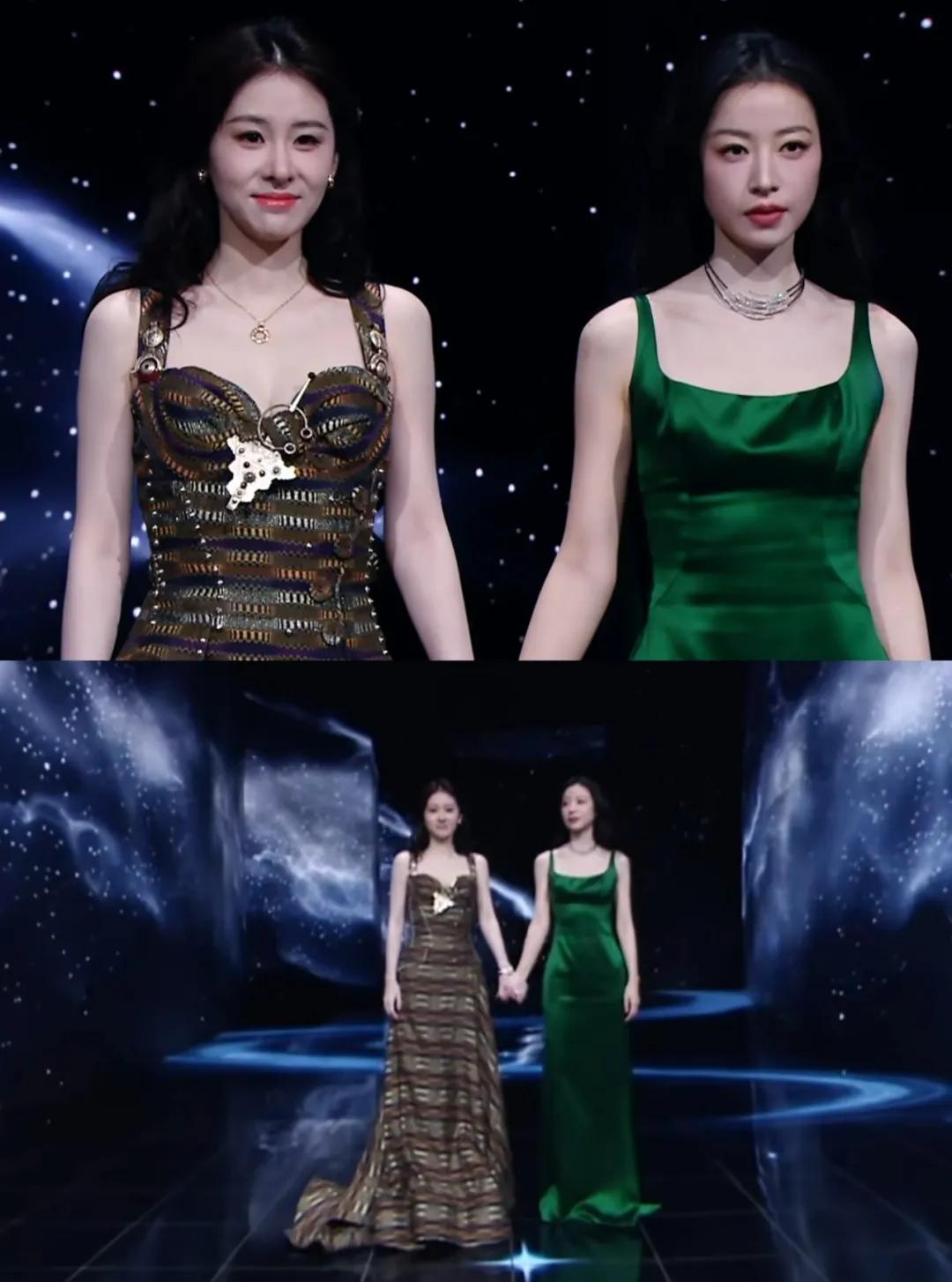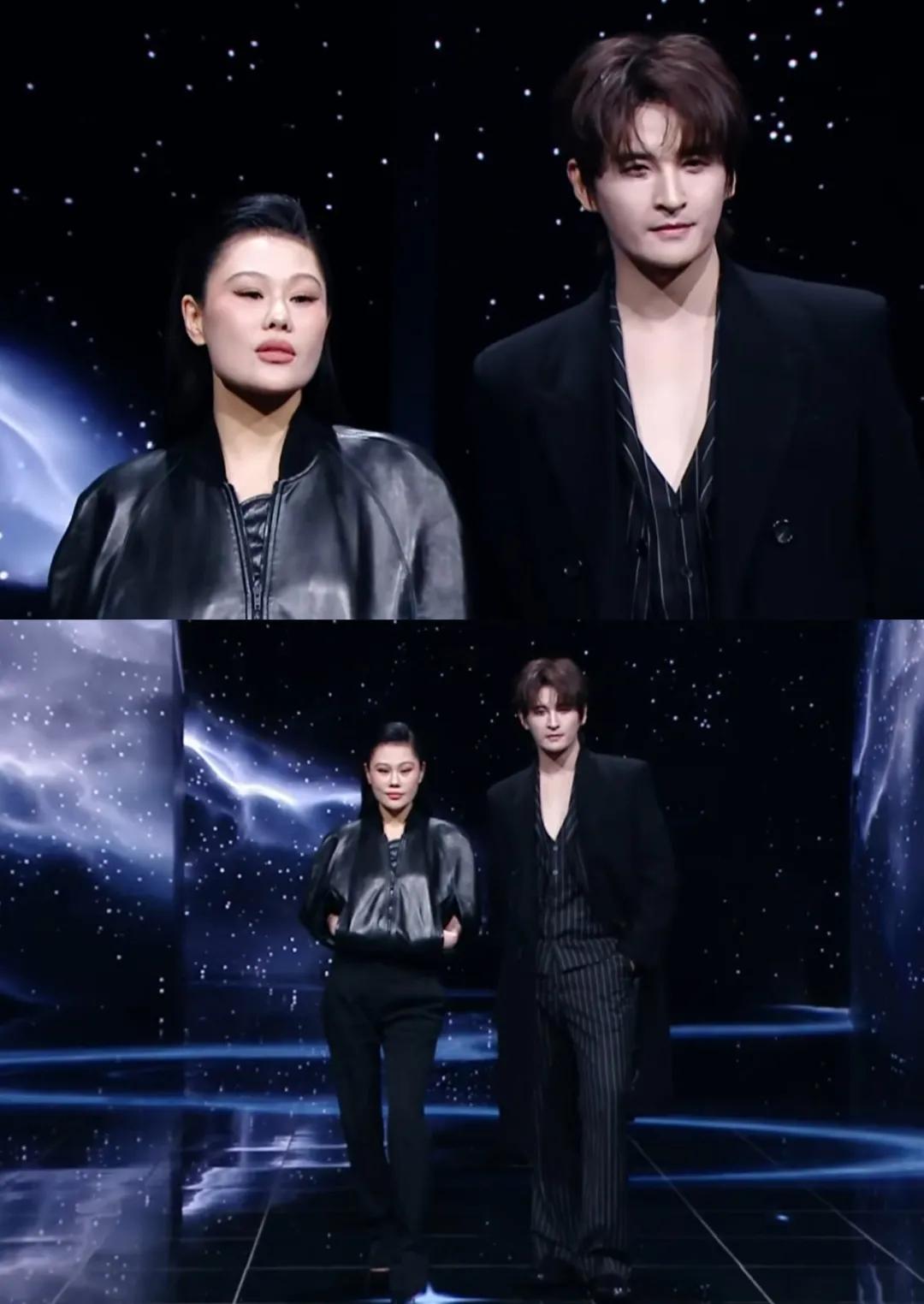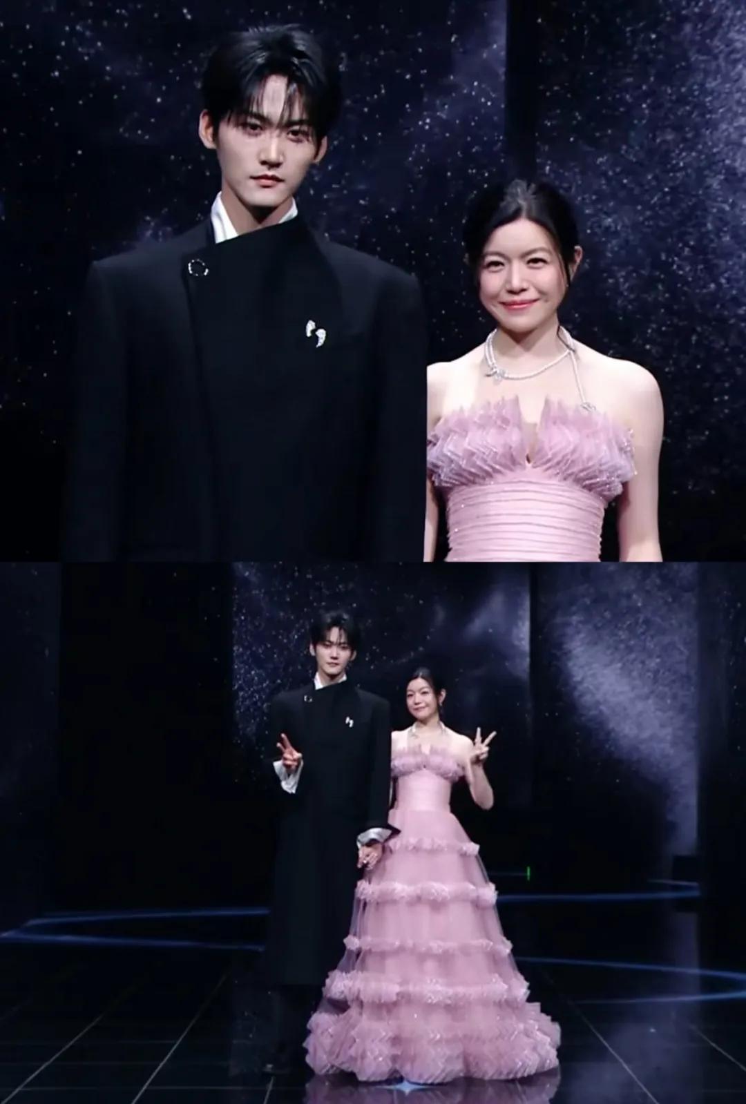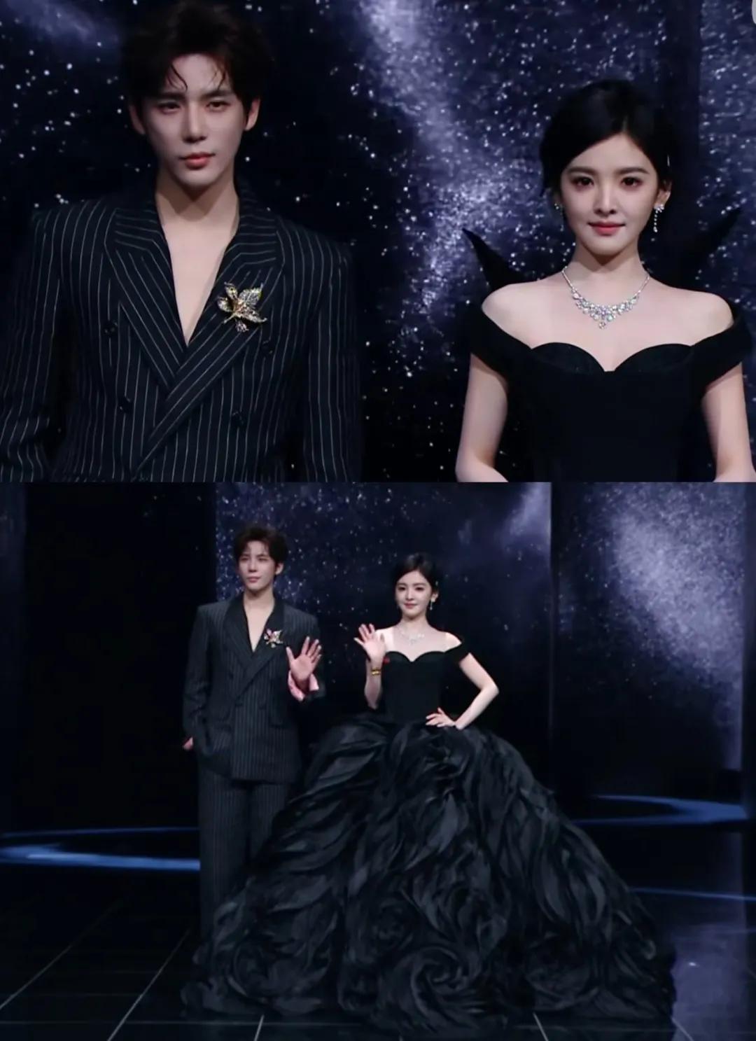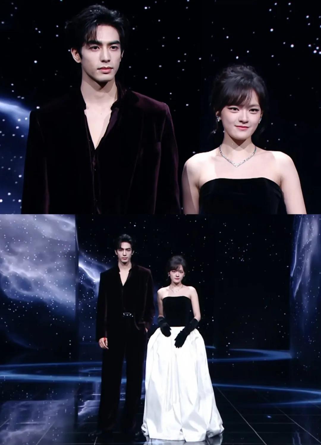 王安宇和章若楠也穿了黑色礼服,闪钻的配饰为他们增添了几分贵气,在星空背景的衬托下很有豪门姐弟的既视感。