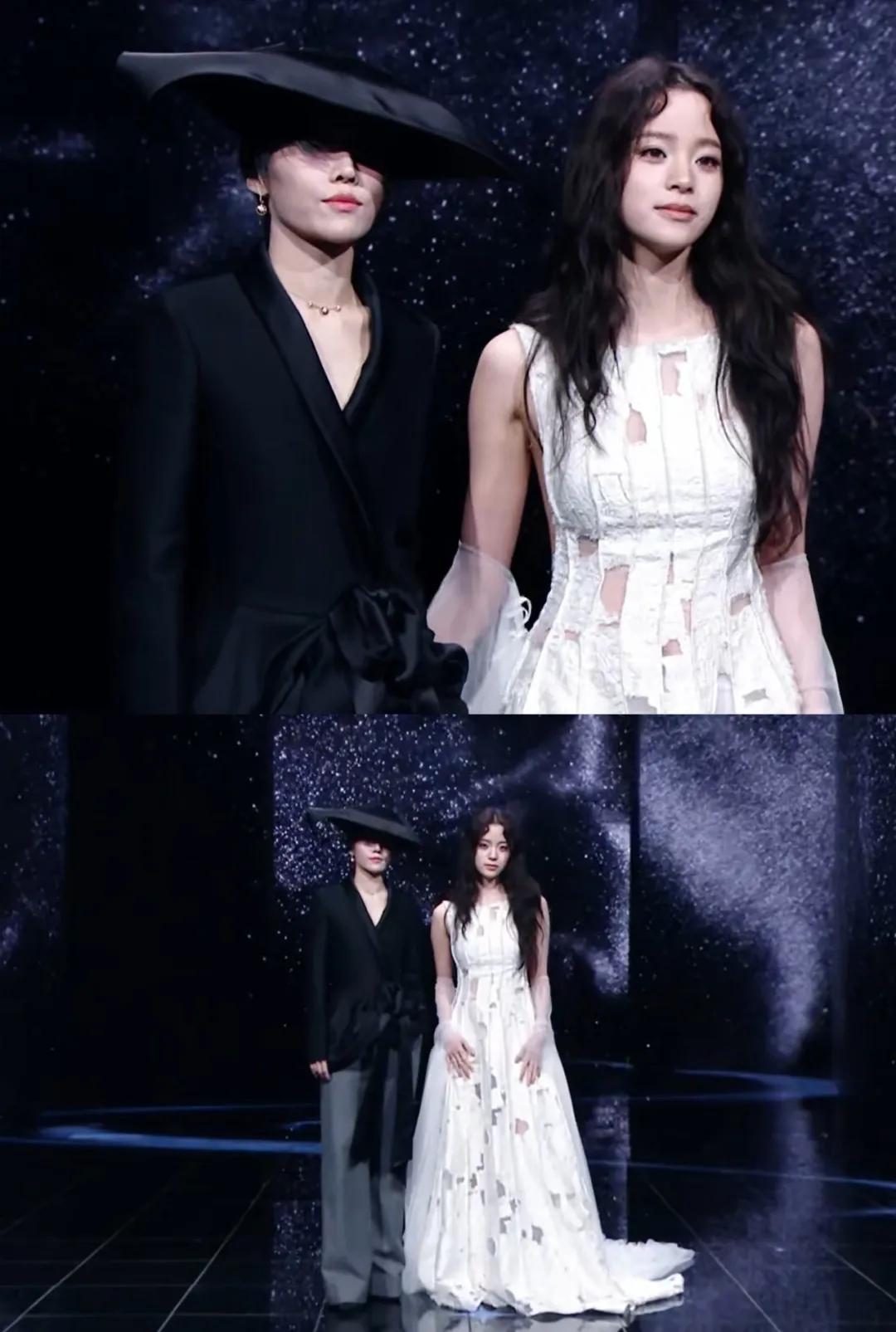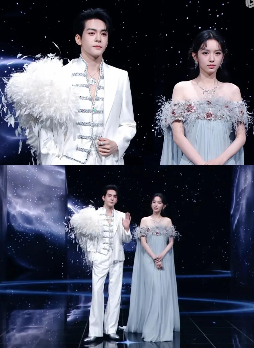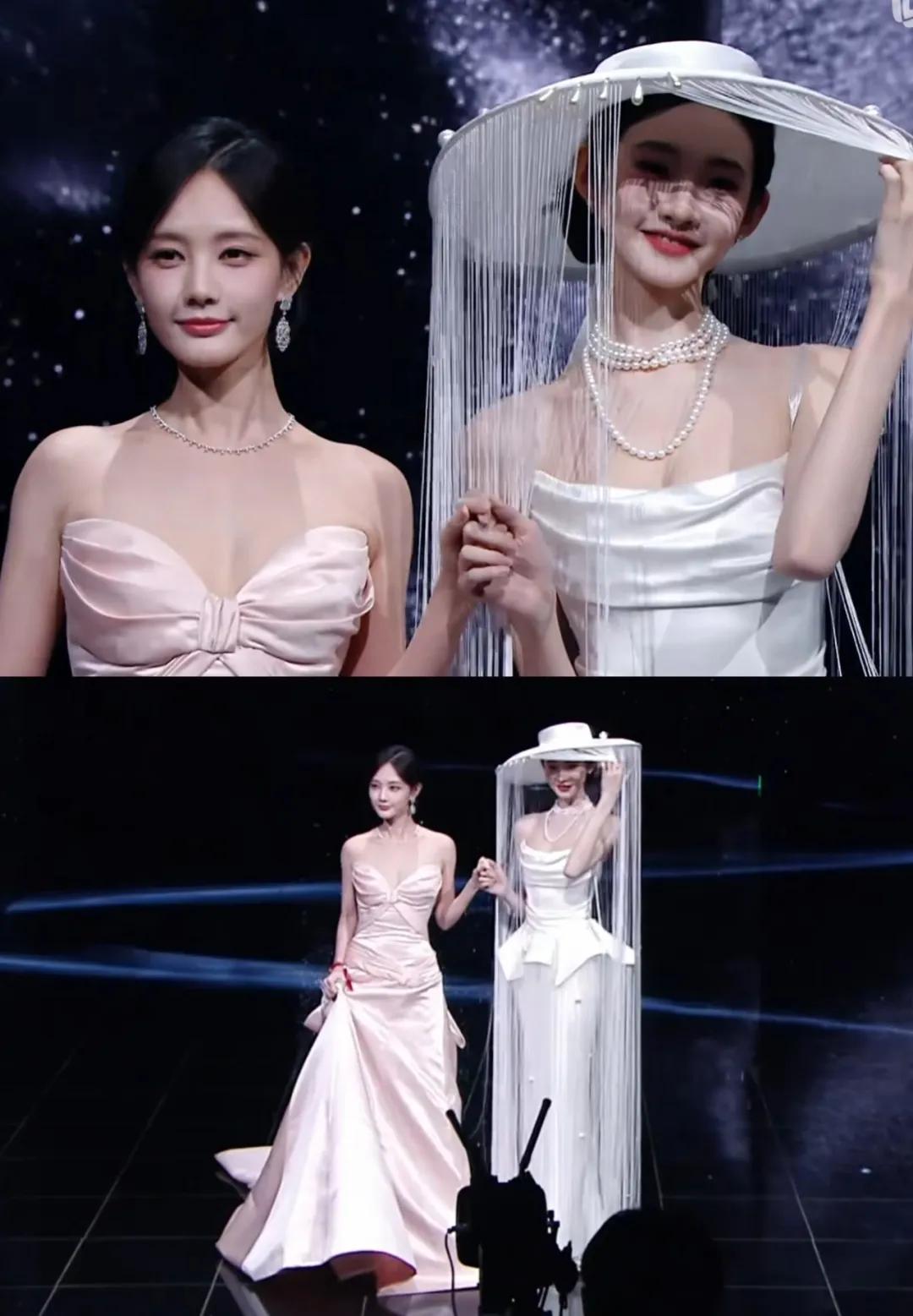 跳水运动员陈芋汐和处于事业上升期的小花卢昱晓,是最让人看不懂的组合。两人的礼服虽然是经典的“黑白配”,但卢昱晓的白裙造型明显更抢镜,毕竟她头上的斗笠式头纱太有存在感了。