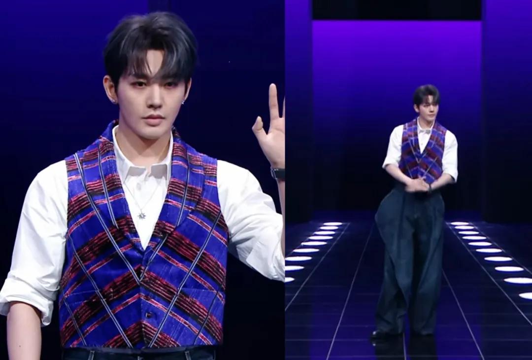 邓为穿了一件蓝紫色马甲,只看上半身的话有点像影视剧里的调酒师,全身照则像时装周上的模特。
