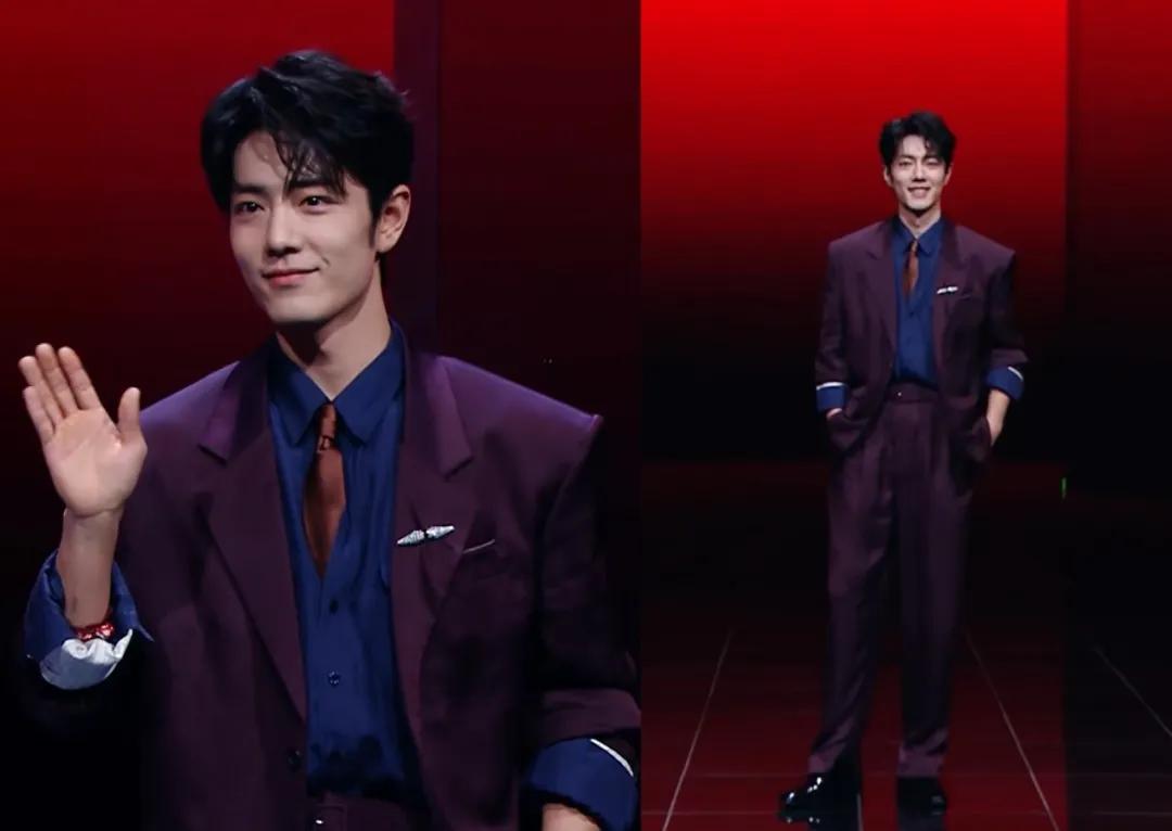 肖战穿了一套紫红色西装,妆发清爽,简简单单就足够帅气。
