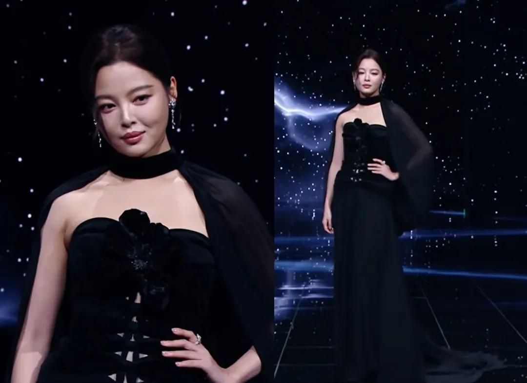 辛芷蕾穿了一条带披肩的黑色长裙,妆发淡雅但自身气势很强。