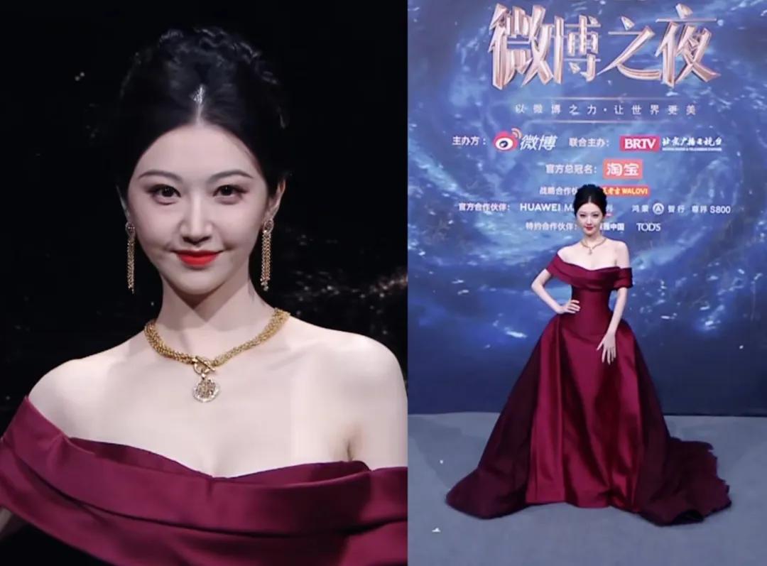 景甜穿了一条酒红色抹胸长裙,很适合肤白貌美的她。