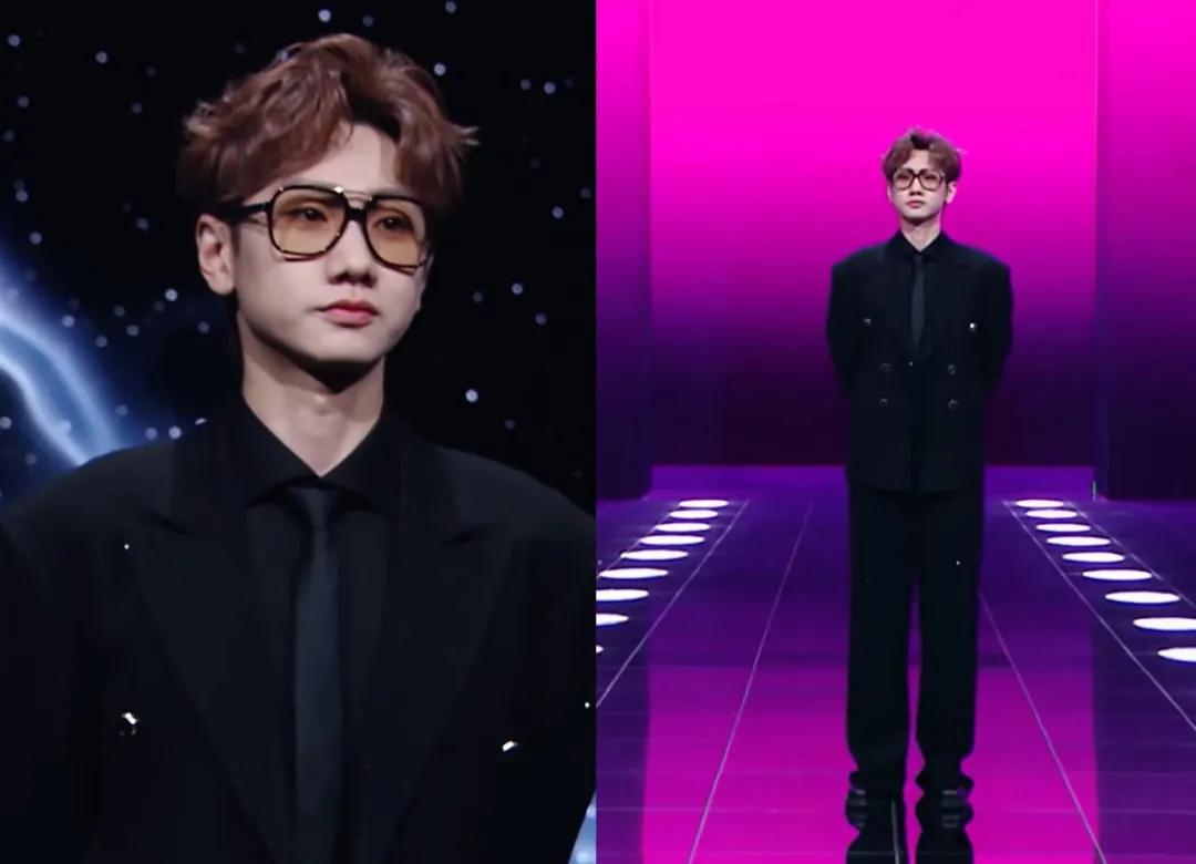 汪苏泷穿了一套简约的黑色西装,黑框眼镜很好地修饰了他的圆脸,整体看起来普通但不失时尚感。