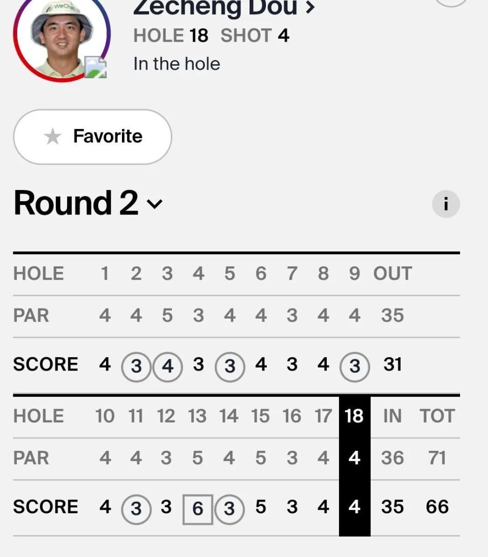 另一位中国球员窦泽成,第二轮状态不错,1号洞出发的他,在2号洞和3号洞连抓小鸟球。随后的5号洞和9号洞,窦泽成都打进小鸟球,以-4的成绩转场。