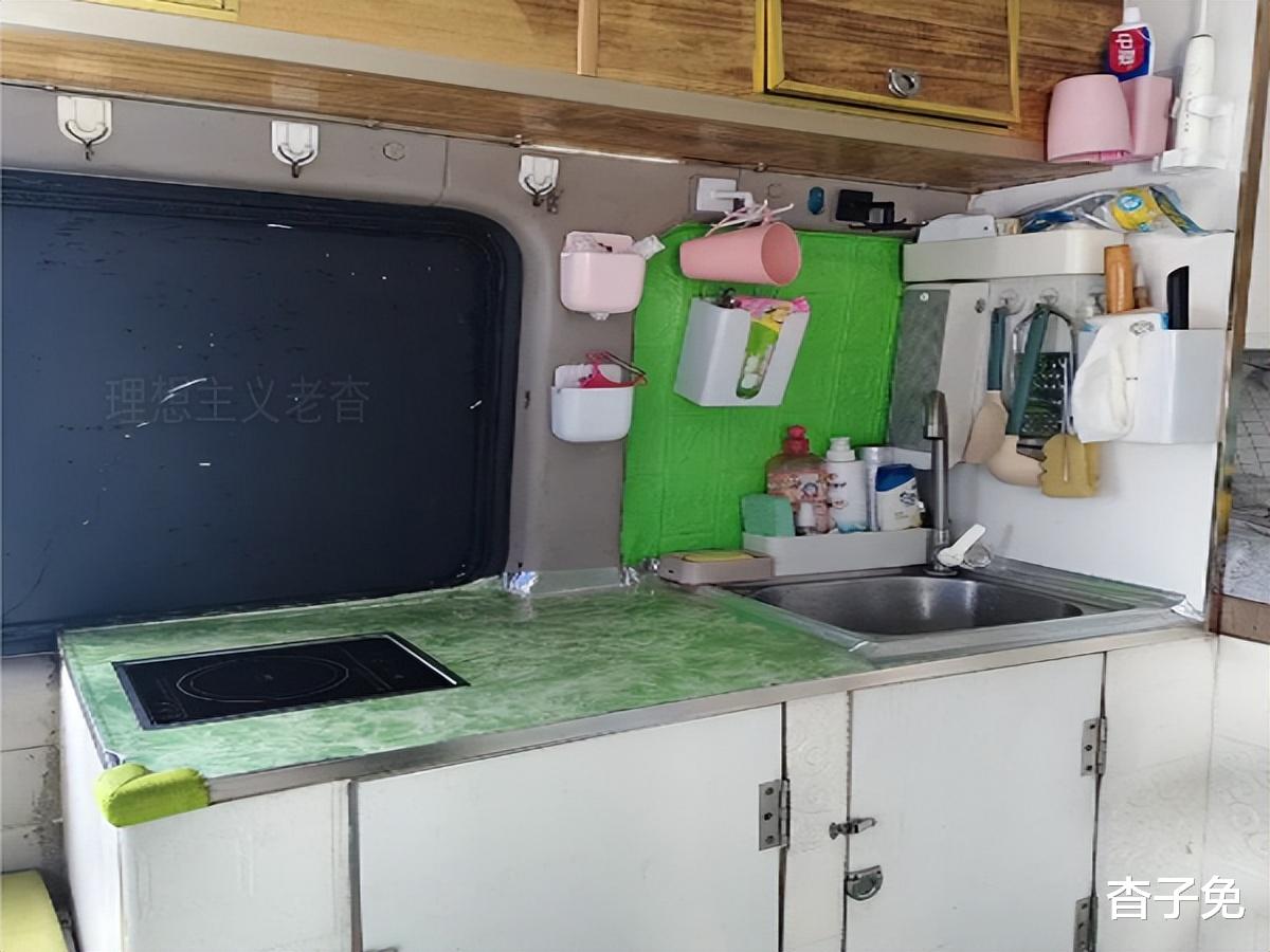 中间右侧是微厨区,下面有水有电有炊具,上面有洗菜池和电磁炉,上部还有挂式餐具和木制吊柜,室内做饭很方便。