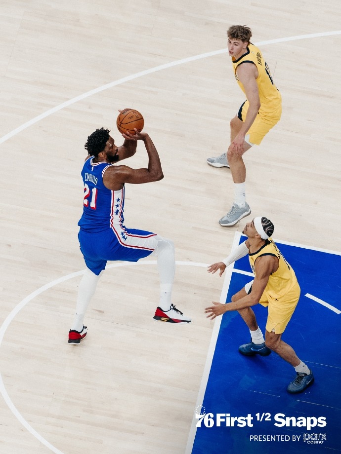 乔治今天缺阵,恩比德和马克西都非常给力。恩比德十分高效,出战33分钟,17投10中,三分1投1中,罚球10罚9中,得到30分9篮板4助攻,只出现1次失误。