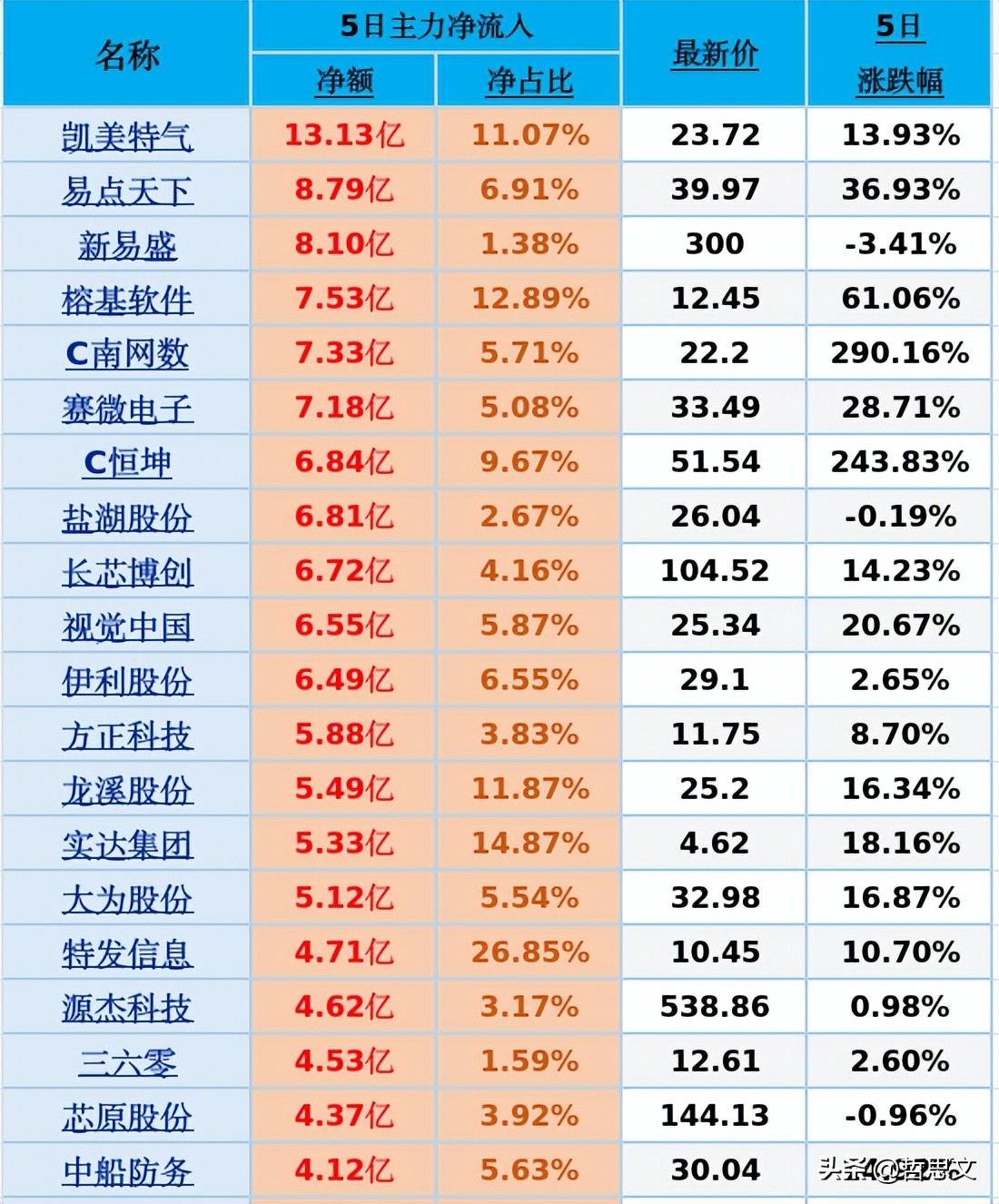 本周净流入排名靠前的1-20,解析如下:凯美特气:净额 + 13.13 亿