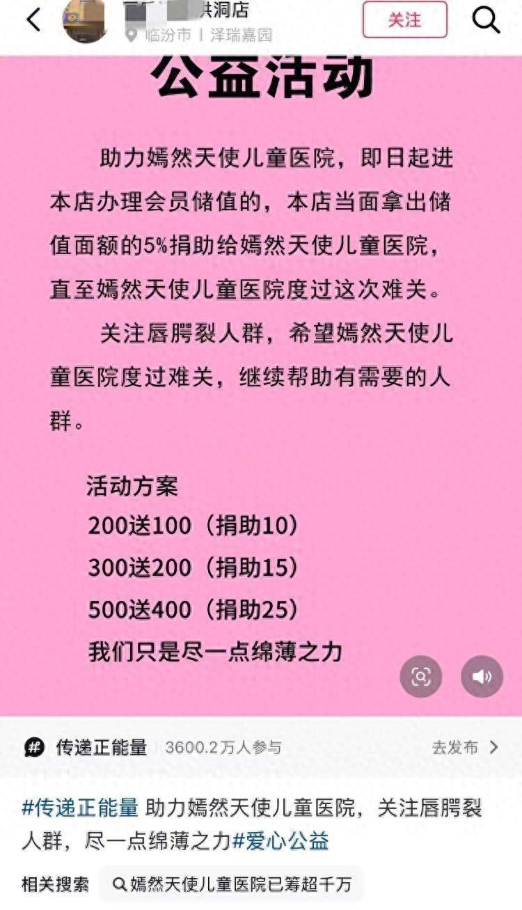 1月16号,当地一家洗衣店突然在抖音炸屏:办会员储值,直接捐5%给嫣然天使儿童医院!充200送100不说,还额外捐10块,号称“消费献爱心,一举两得”。