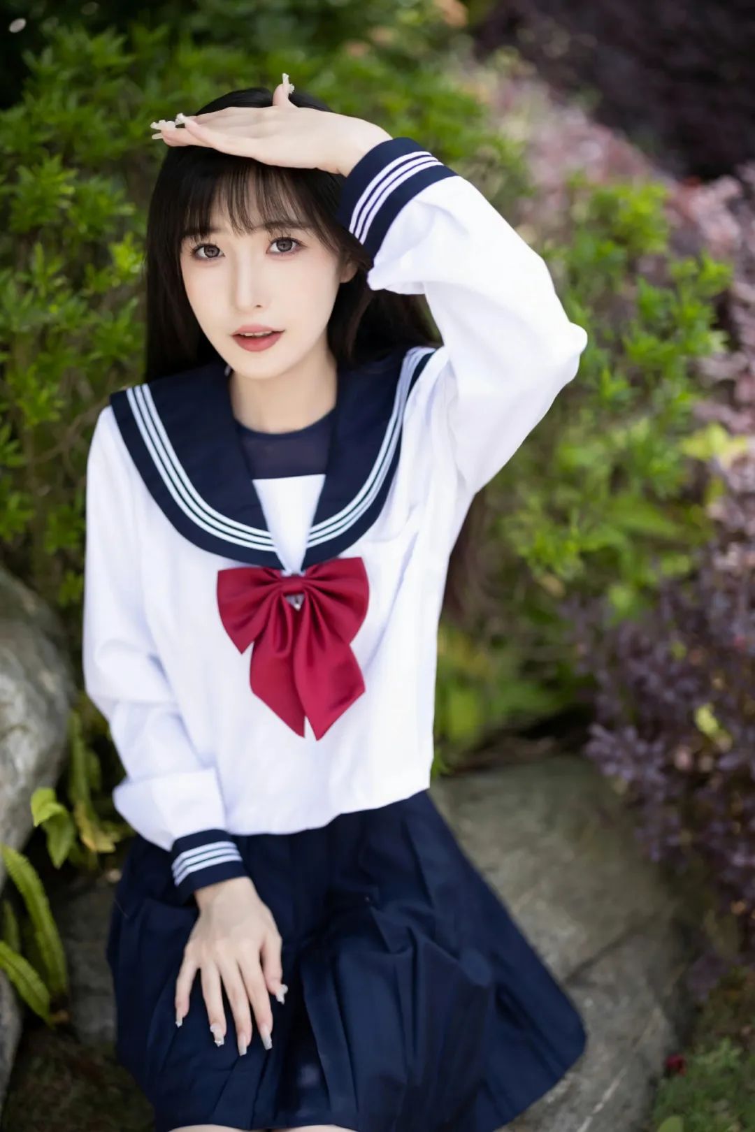 总的来说,这组摄影作品展现了绝美JK女神林星阑的魅力、优雅和内外兼修的特质。摄影师运用高超的摄影技巧,巧妙地利用自然光线和环境,将美丽的度假村背景与林星阑的美貌相得益彰。深蓝色制服、紫红色蝴蝶结和黑丝袜的搭配为整体画面增色不少,而林星阑的自信微笑和清秀五官则将美的内涵深刻地呈现。