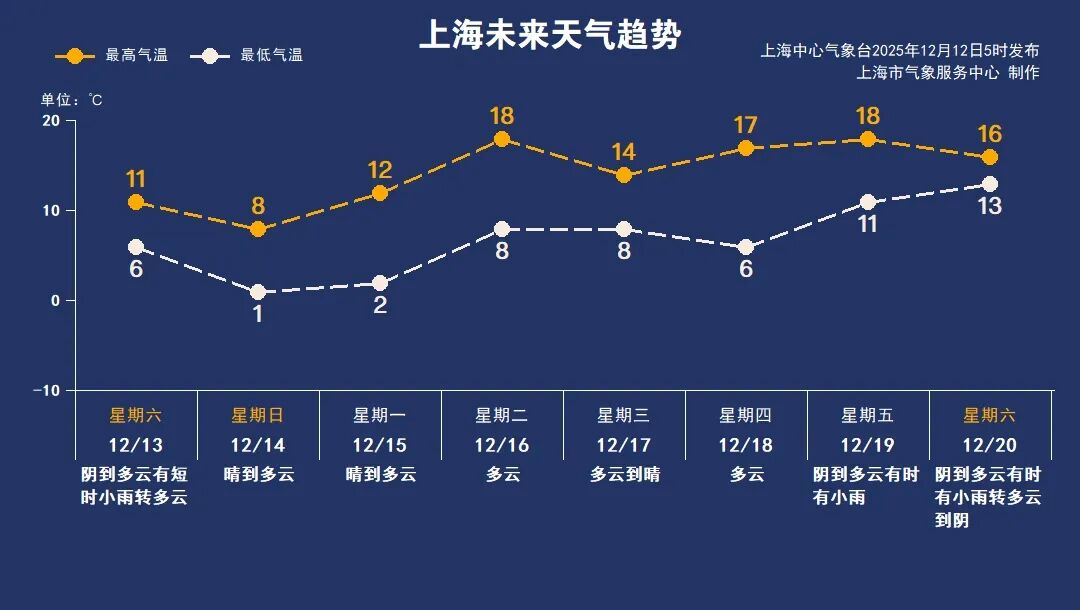 12月13日(周六):阴到多云有短时小雨转多云,6~11℃