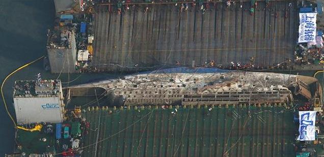 2017年3月,韩国木浦新港,锈迹斑驳的“世越号”终于重见天日,在半潜船的托举下缓缓靠岸。