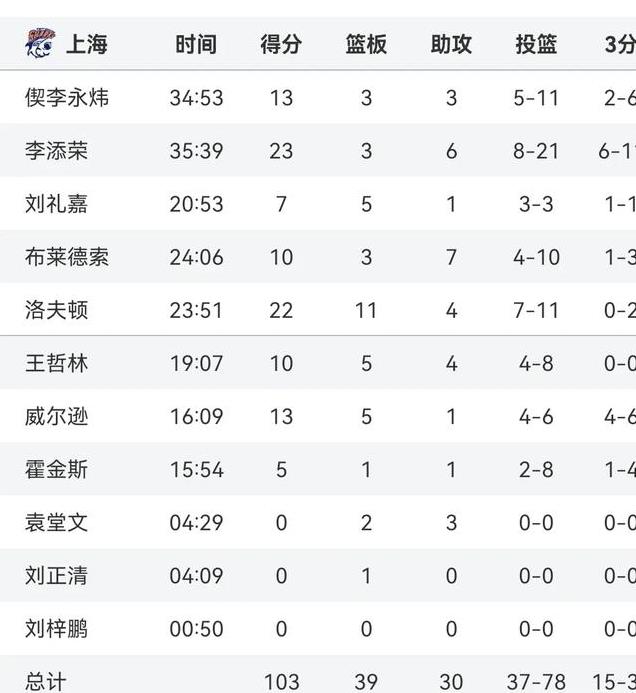 上海,李添荣23+3+6,洛夫顿22+11,偰李永炜13分。