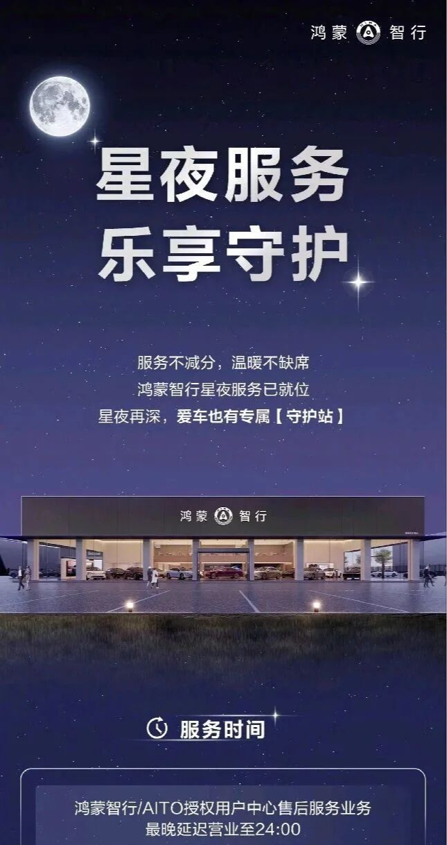 生态协同,提升用户体验豪华市场的竞争最终落在体验上,鸿蒙智行通过生态协同解决了传统痛点。服务方面,联盟打造了行业首个跨品牌共享售后服务中心网络,并推出“星夜服务”——全国近200家网点延长营业时间至午夜,车主下班后可保养,还提供免费简餐和20公里内送车上门。