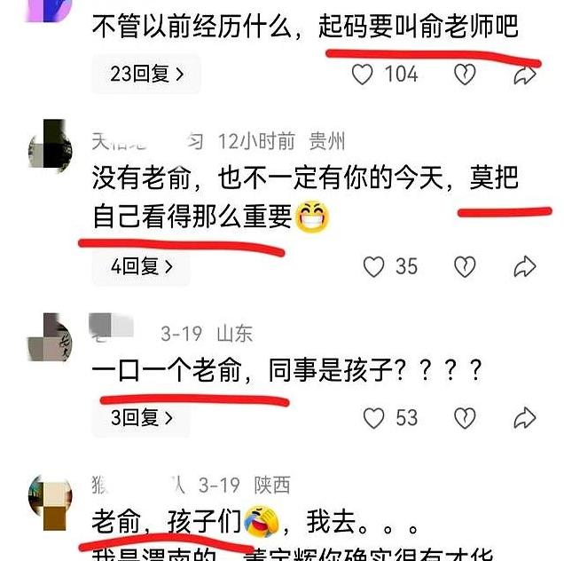 这“老俞”听着多刺耳啊,一点尊重都没有。有些粉丝都看不下去了,以前评论区里那些“丈母娘”们,这回也集体沉默了。当然,也有人觉得网友反应过度了。人家在公司的时候就叫“老俞”,说不定就是一种企业文化,怎么现在就成了大逆不道了?再说,董宇辉现在也是老板了,跟老俞平起平坐,叫“老俞”也没啥毛病吧?其实啊,这事儿还真不好说。