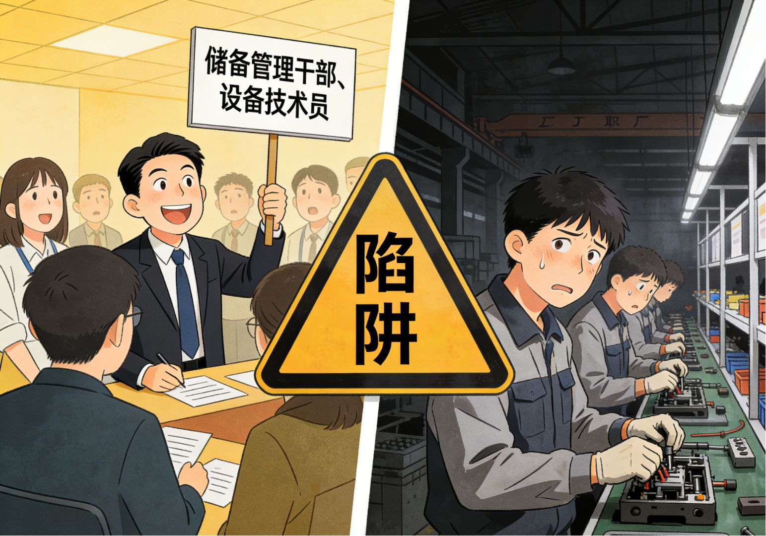 企业套路特征:xxx某外包公司、四川部分电子厂等企业,高频使用“设备技术员”“产线储备干部”等名称,实际招聘需求为“能适应倒班、服从产线安排”。