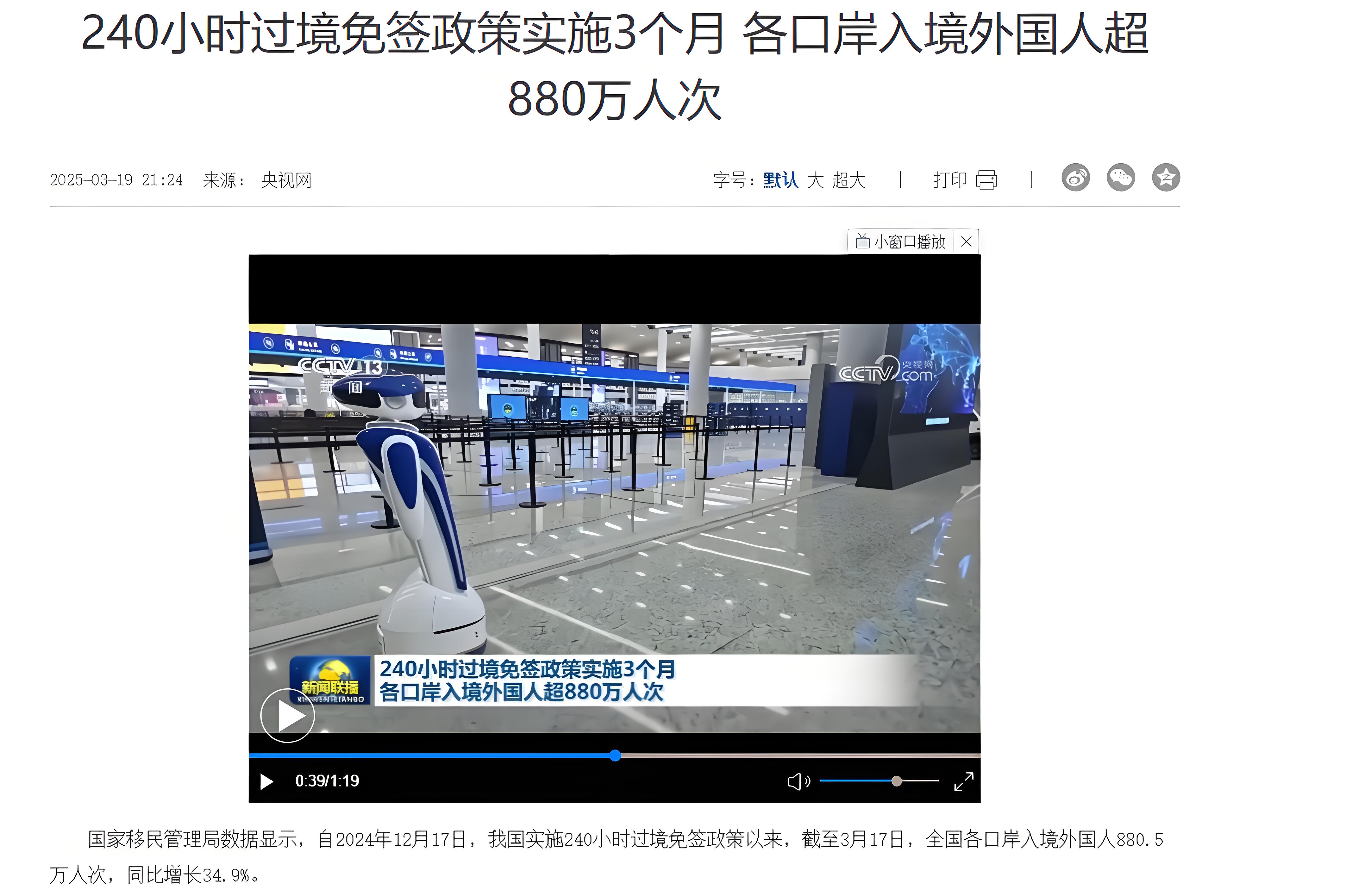 2.《240小时过境免签政策实施3个月 各口岸入境外国人超880万人次》 央视网