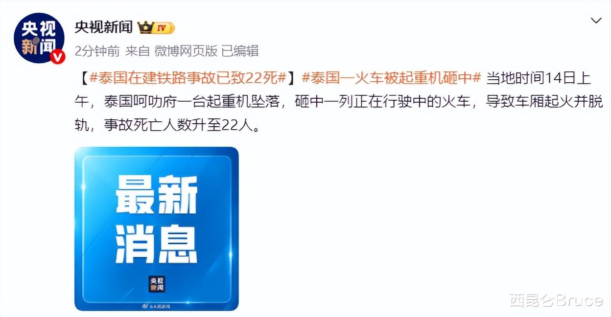 2026年1月14日,泰国呵叻府发生一起严重事故。一台正在中泰高铁项目工地上作业的起重机突然从高空坠落,砸中一列载有约200名乘客的火车,导致车厢起火并脱轨。这起事故已造成22人死亡、55人受伤。