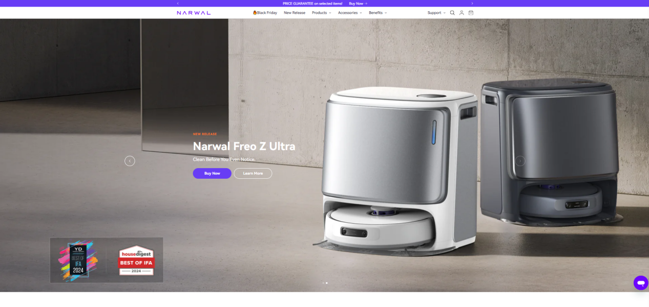 云鲸的独立站首页以产品展示为核心,突出了拖布自清洁等功能亮点,同时设置了“新品”和“热销产品”板块,方便用户快速浏览感兴趣的产品。
