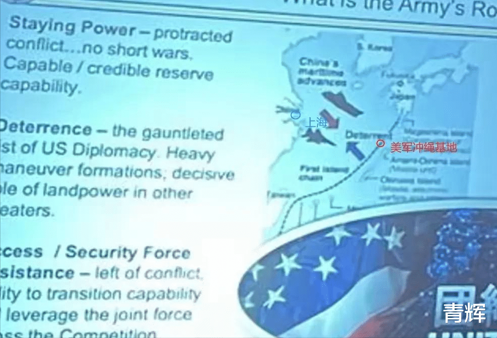 在上面这张图中,我们能够看到,一旦台海出现战争,美军将马上依托冲绳基地为前线基地,迅速派出海空兵进入中国的东海,在东海范围内进行持续的作战,并且派遣作战人员直接攻击上海。