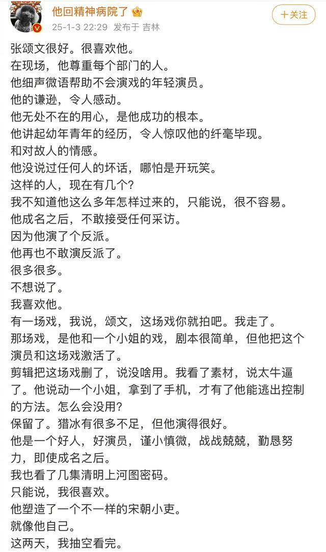 导演高群书率先发声,他与张颂文一同合作过电视剧《猎冰》。在他的讲述里,张颂文是一颗散发着温暖人性的星星。他说张颂文在为人处世方面堪称楷模。他的性格就如同涓涓细流,对待同事总是轻声细语的,在他身上从未发现过说人坏话这种不良习惯。在娱乐圈这个充满了功名利禄的染缸里,他在成名之后依然保持着最初的那份善良与纯真,这种品质就像一颗熠熠生辉的钻石,在黑暗中也能闪耀出璀璨的光芒。