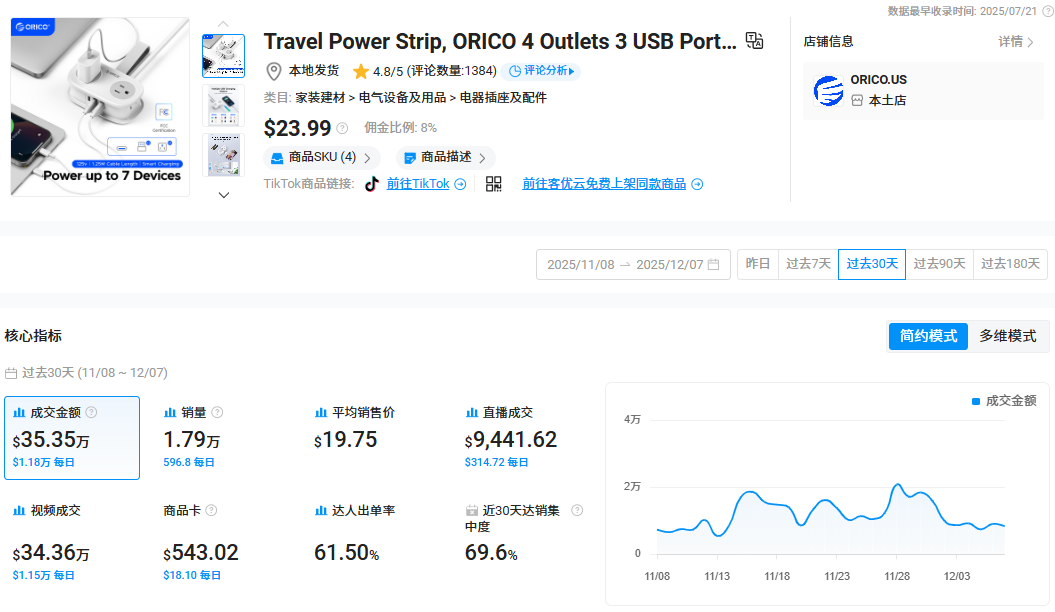 自7月份上架以来,目前ORICO品牌这款旅行插排已经卖出了4.58万单,总成交金额为102.03万美元,对于客单价23美元左右的插排来讲,已经是不错的成绩了。