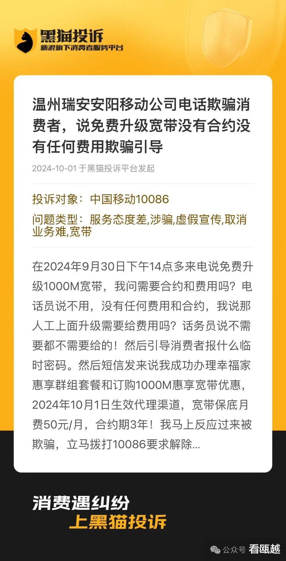 瑞安安阳移动公司电话欺骗消费者,说免费升级宽带没有合约没有任何费用欺骗引导