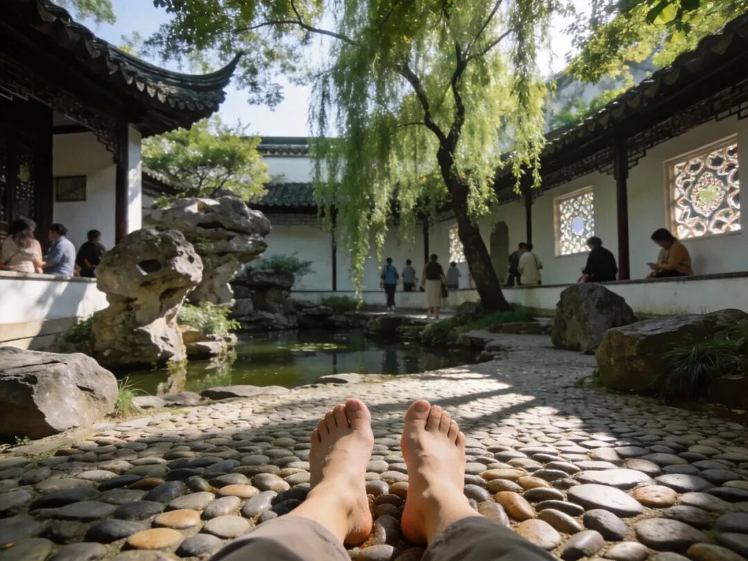 游客光脚踩在苏州园林的鹅卵石铺地上,体验足底按摩