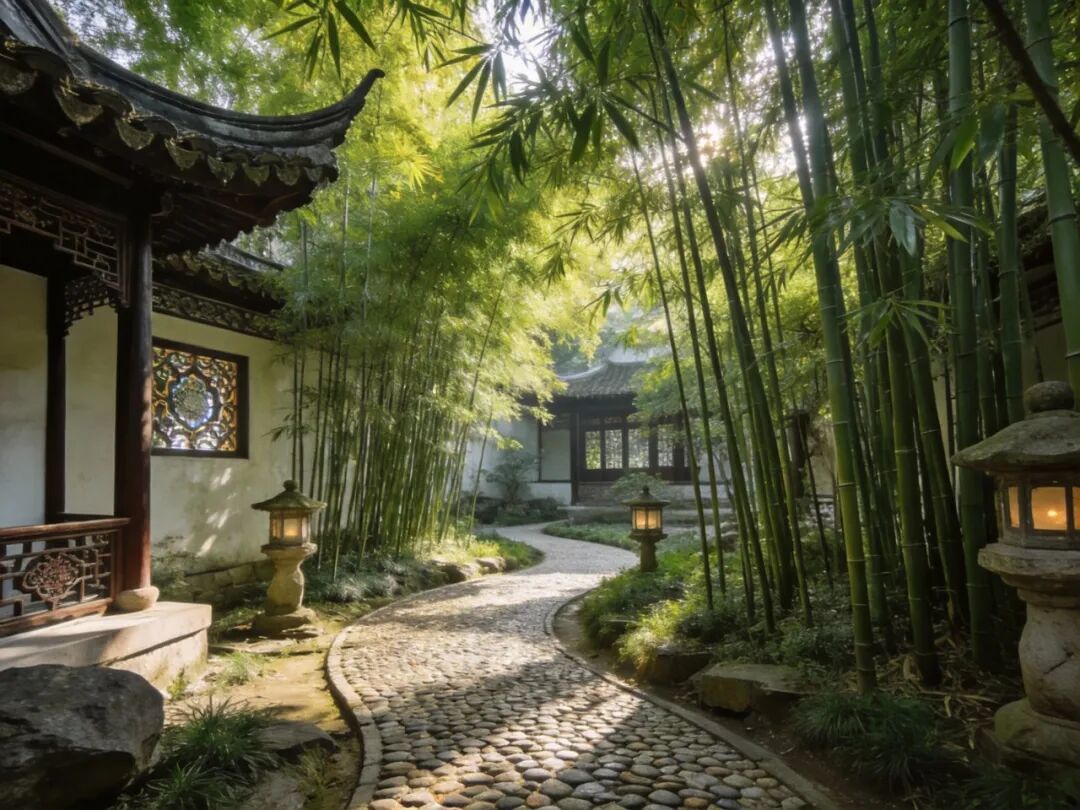 苏州园林里用鹅卵石铺成的蜿蜒小径,旁边是竹林
