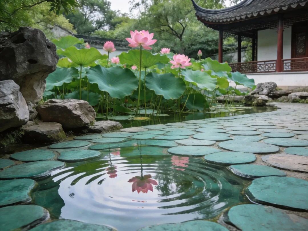 除了材料和铺法,计成还特别讲究铺地和周围环境的搭配,用现在的话来说就是「氛围感拉满」。比如在假山旁边,要铺那种不规则的碎石子,模仿山间的小路,让你一踩上去就感觉自己在爬山;在荷花池旁边,要铺那种像水波一样的瓦片图案,仿佛脚下就是一池春水;在竹林深处,要铺那种用竹叶形状的瓦片拼成的小路,走进去就像走进了一片绿色的隧道。