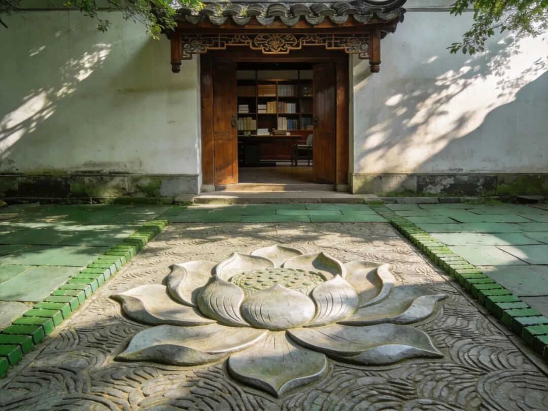 苏州园林书房门口的莲花图案铺地,象征高洁清廉